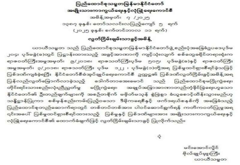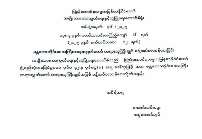 မန္တလေးတိုင်းဒေသကြီးတရားလွှတ်တော် တရားသူကြီးချုပ် ခန့်အပ်တာဝန်ပေးခြင်း