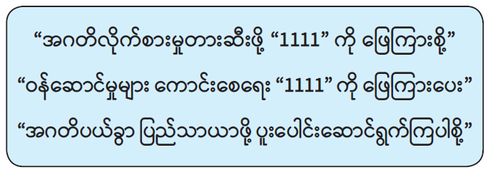 ၃။ အများပြည်သူထံမှ တုံ့ပြန်မှုရယူခြင်းအစီအစဉ်အရ အဂတိလိုက်စားမှုတိုက်ဖျက်ရေးကော်မရှင်နှင့် ပြည်ထောင်စုဝန်ကြီးဌာန/ အဖွဲ့အစည်း များထံမှ Short Code နံပါတ် “1111” ဖြင့် ဝန်ဆောင်မှုရယူစဉ်က ကြုံတွေ့ခဲ့ရသည့် အခြေအနေများနှင့်စပ်လျဉ်း၍ ပေးပို့မေးမြန်း လိုက်သော SMS များကို မှန်ကန်စွာ ပြန်လည်ဖြေကြားပေးခြင်းဖြင့် သက်ဆိုင်ရာဌာနအသီးသီး၏ ဝန်ဆောင်မှုလုပ်ငန်းအရည်အသွေးကို သိရှိနိုင်မည်ဖြစ်ပြီး အဂတိလိုက်စားမှု တားဆီးကာကွယ်ရေးအတွက် လိုအပ်ချက်များကို ပြုပြင်နိုင်မည်ဖြစ်ပါသည်။
