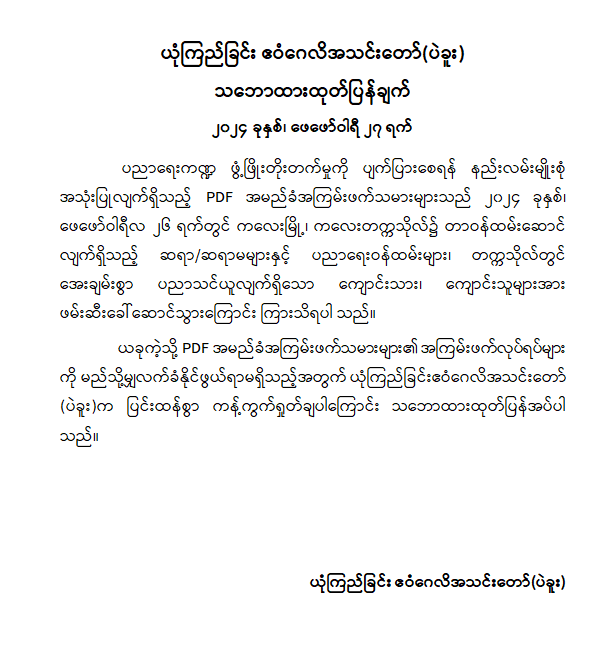 ယုံကြည်ခြင်း ဧဝံဂေလိအသင်းတော် (ပဲခူး) သဘောထားထုတ်ပြန်ချက်