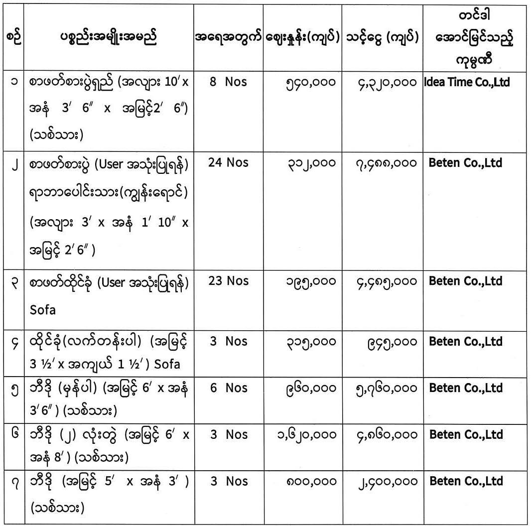 ပုံနှိပ်ရေးနှင့်ထုတ်ဝေရေးဦးစီးဌာနအတွက် ၂ဝ၂၅-၂ဝ၂၆ ဘဏ္ဍာရေးနှစ်၊ ငွေလုံးငွေရင်းအသုံးစရိတ်ဖြင့် ရုံးသုံး/လုပ်ငန်းသုံးပရိဘောဂပစ္စည်း (၂၉)မျိုးမှ ပစ္စည်း(၂၃)မျိုးအား ဝယ်ယူရန် ပြည်တွင်း/ပြည်ပပစ္စည်းများ ဝယ်ယူရေးနှင့်ထုခွဲရောင်းချရေးကော်မတီမှ (၁၄-၈-၂ဝ၂၅) ရက် နံနက် (၁ဝ : ဝဝ) နာရီတွင် စိစစ်ခဲ့သည့် ဈေးနှုန်းများအနက် အနည်းဆုံးပေးသွင်းသည့် အောက်ပါကုမ္ပဏီများမှ ယှဉ်တွဲပါဈေးနှုန်း၊ အရေအတွက်တို့ဖြင့် တင်ဒါအောင်မြင်ကြောင်း ပြန်ကြားရေးဝန်ကြီးဌာန၊ စီမံခန့်ခွဲရေးကော်မတီအစည်းအဝေးအမှတ်စဉ်(၁၂/၂ဝ၂၅) ဆုံးဖြတ်ချက်အရ ကြေညာအပ်ပါသည်-