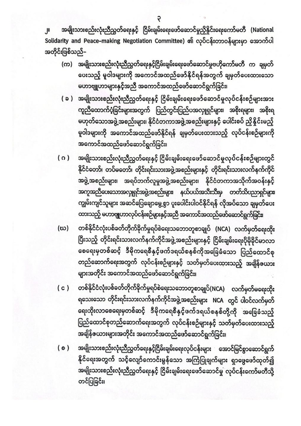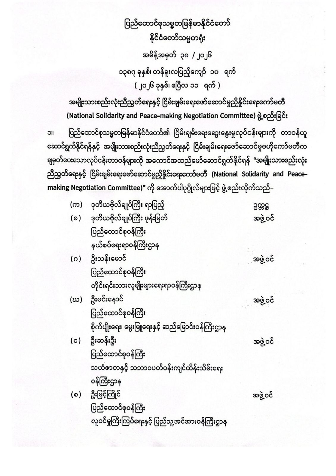 အမျိုးသားစည်းလုံးညီညွတ်ရေးနှင့် ငြိမ်းချမ်းရေးဖော်ဆောင်မှုညှိနှိုင်းရေးကော်မတီ (National Solidarity and Peace-making Negotiation Committee) ဖွဲ့စည်းခြင်း 04/12/2026