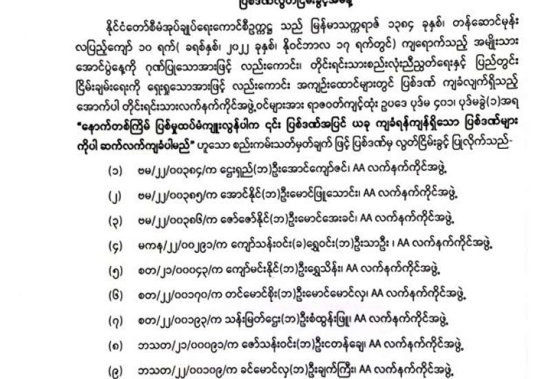 နိုင်ငံတော်စီမံအုပ်ချုပ်ရေးကောင်စီဥက္ကဋ္ဌသည် ၂၀၂၂ ခုနှစ်၊ နိုဝင်ဘာလ ၁၇ ရက်နေ့တွင် အမိန့်အမှတ် ၇၀/ ၂၀၂၂၊ ၇၁/ ၂၀၂၂၊ ၇၂/ ၂၀၂၂၊ ၇၃/ ၂၀၂၂ နှင့် ၇၄/ ၂၀၂၂ တို့ဖြင့် အကျဉ်းထောင်၊ အကျဉ်းစခန်းနှင့် အလုပ်စခန်းအသီးသီးတို့တွင် ပြစ်ဒဏ်ကျခံလျက်ရှိသော အကျဉ်းသား၊ အကျဉ်းသူ စုစုပေါင်း ၅၇၇၄ ဦးနှင့် အခြားအကျဉ်းသား ၅ ဦးတို့ကို ပြစ်ဒဏ်လွတ်ငြိမ်းခွင့်ပြုခဲ့ပါသည်။