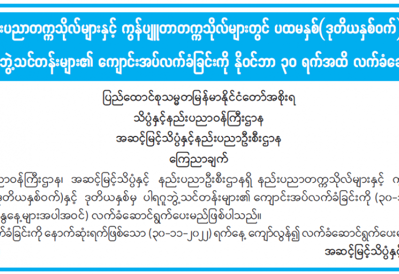 နည်းပညာတက္ကသိုလ်များနှင့် ကွန်ပျူတာတက္ကသိုလ်များတွင် ပထမနှစ်(ဒုတိယနှစ်ဝက်)နှင့် ဒုတိယနှစ်မှ ပါရဂူဘွဲ့သင်တန်းများ၏ ကျောင်းအပ်လက်ခံခြင်းကို နိုဝင်ဘာ ၃၀ ရက်အထိ လက်ခံဆောင်ရွက်ပေးမည်