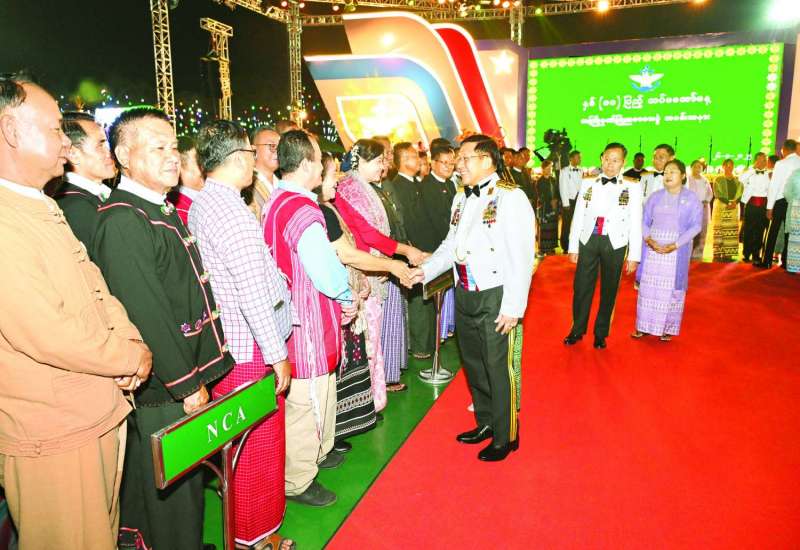 နိုင်ငံတော်စီမံအုပ်ချုပ်ရေးကောင်စီဥက္ကဋ္ဌ တပ်မတော်ကာကွယ်ရေးဦးစီးချုပ် ဗိုလ်ချုပ်မှူးကြီးမင်းအောင်လှိုင်နှင့်ဇနီး ဒေါ်ကြူကြူလှတို့က တည်ခင်းဧည့်ခံသည့် ၂၀၂၅ ခုနှစ် နှစ် (၈၀) ပြည့် တပ်မတော်နေ့အထိမ်းအမှတ် အကြိုဂုဏ်ပြုညစာစားပွဲ အခမ်းအနားကို ယနေ့ညပိုင်းတွင် နေပြည်တော်ရှိ ဇေယျာသီရိဗိမာန် ဥပစာရင်ပြင်၌ ကျင်းပပြုလုပ်သည်။