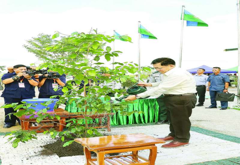 ပြည်ထောင်စုနယ်မြေ၊ နေပြည်တော်၊ ၂၀၂၅ ခုနှစ်၊ တတိယအကြိမ် မိုးရာသီသစ်ပင်စိုက်ပျိုးပွဲအခမ်းအနားကို ယနေ့နံနက်ပိုင်းတွင် ပြည်ထောင်စုနယ်မြေ နေပြည်တော်၊ ဒက္ခိဏသီရိမြို့နယ်၊ မာရဝိဇယဗုဒ္ဓရုပ်ပွားတော်မြတ်ကြီး ပရိဝုဏ်တော်အနီး၌ ကျင်းပရာ ပြည်ထောင်စုသမ္မတမြန်မာနိုင်ငံတော် ယာယီသမ္မတ နိုင်ငံတော်လုံခြုံရေးနှင့်အေးချမ်းသာယာရေးကော်မရှင်ဥက္ကဋ္ဌ ဗိုလ်ချုပ်မှူးကြီး မင်းအောင်လှိုင် တက်ရောက်၍ ခရေပျိုးပင်ကို ဦးဆောင်စိုက်ပျိုးပေးသည်။