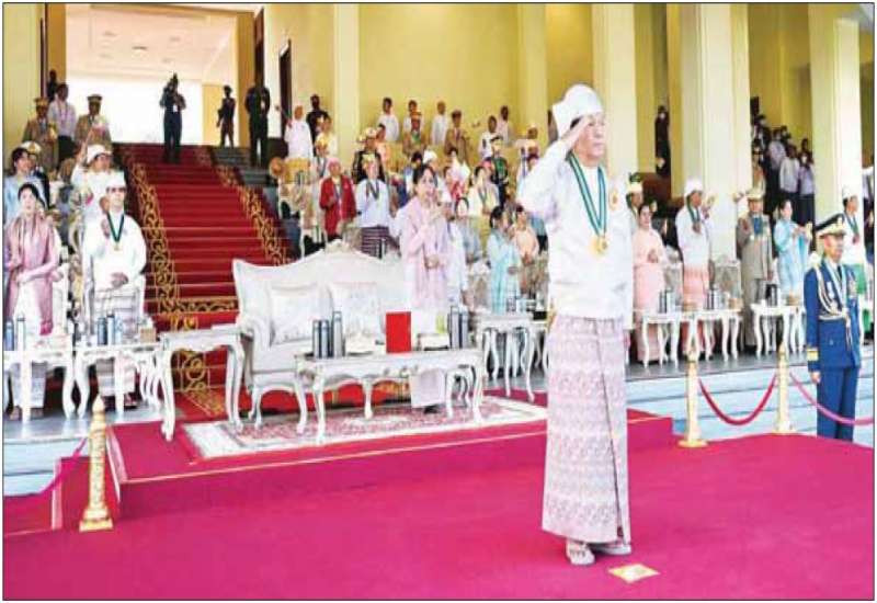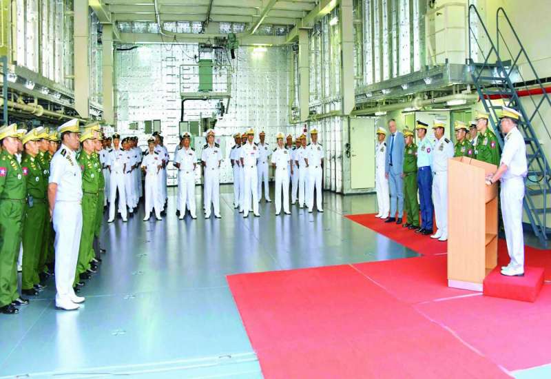 ပြည်ထောင်စုသမ္မတမြန်မာနိုင်ငံတော်၊ တပ်မတော်(ရေ)၏ (၇၅)နှစ်မြောက် စိန်ရတုတပ်မတော်(ရေ)နှစ်ပတ်လည်နေ့တွင် နိုင်ငံတော်၏ရေကြောင်းဆိုင်ရာအကျိုးစီပွားများနှင့် မြန်မာ့ပင်လယ်ပြင်သီးသန့်စီးပွားရေးဇုန်အား အပြည့်အဝကာကွယ် စောင့်ရှောက်နိုင်ရန်အတွက် စစ်ရေယာဉ်များတပ်တော်ဝင်ခြင်းနှင့် မြန်မာနိုင်ငံကမ်းခြေစောင့်တပ်ဖွဲ့သို့ လွှဲပြောင်းတပ်တော်ဝင်ခြင်းအခမ်းအနားကို ရန်ကုန်မြို့ရှိ အမှတ်(၃)ရေတပ်ဆိပ်ခံတံတား၌ ကျင်းပပြုလုပ်ရာ နိုင်ငံတော်စီမံအုပ်ချုပ်ရေးကောင်စီဥက္ကဋ္ဌ တပ်မတော်ကာကွယ်ရေးဦးစီးချုပ် ဗိုလ်ချုပ်မှူးကြီးမင်းအောင်လှိုင် တက်ရောက်ဂုဏ်ပြုချီးမြှင့်သည်။