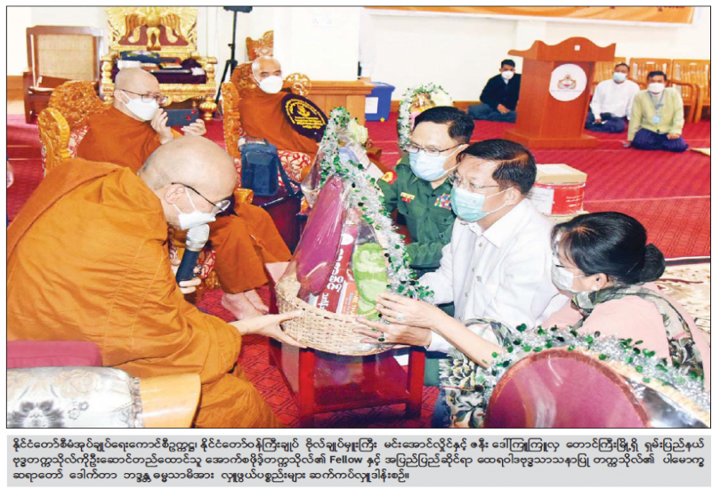နိုင်ငံတော်စီမံအုပ်ချုပ်ရေးကောင်စီဥက္ကဋ္ဌ၊ နိုင်ငံတော်ဝန်ကြီးချုပ် ဗိုလ်ချုပ်မှူးကြီး မင်းအောင်လှိုင်သည် ယနေ့ နံနက်ပိုင်းတွင် ဇနီးဒေါ်ကြူကြူလှ၊ နိုင်ငံတော်စီမံအုပ်ချုပ်ရေး ကောင်စီ အဖွဲ့ဝင်များ၊ ပြည်ထောင်စုဝန်ကြီးများ၊ ရှမ်းပြည်နယ်ဝန်ကြီးချုပ်၊ ကာကွယ်ရေး ဦးစီးချုပ်ရုံးမှ တပ်မတော် အရာရှိကြီးများနှင့် ဇနီးများ၊ အရှေ့ပိုင်းတိုင်းစစ်ဌာနချုပ် တိုင်းမှူးနှင့် တာဝန်ရှိသူများ လိုက်ပါ၍ ရှမ်းပြည်နယ် (တောင်ပိုင်း)၊ တောင်ကြီးမြို့၊ ပန်းတင်ကျေးရွာအုပ်စု၊ ဘုရားဖြူရပ်ကွက်ရှိ ရှမ်းပြည်နယ် ဗုဒ္ဓတက္ကသိုလ် (Shan State Buddish University)သို့ သွားရောက်၍ ကမ္ဘာ့ဗုဒ္ဓသာသနာပြု အောက်စဖိုဒ့် ဆရာတော်အား ဖူးမြော်ကြည်ညိုပြီး လှူဖွယ် ပစ္စည်းများ ဆက်ကပ်လှူဒါန်းသည်။