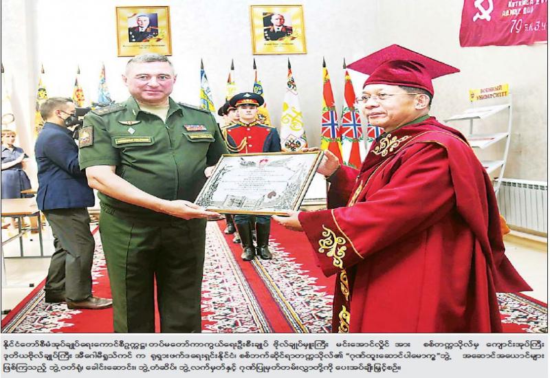 (၉)ကြိမ်မြောက် နိုင်ငံတကာလုံခြုံရေးဆိုင်ရာညီလာခံ (Moscow Conference on International Security-2021(MCIS-2021))သို့ ပါဝင်တက်ရောက်ခဲ့သည့် နိုင်ငံတော် စီမံအုပ်ချုပ်ရေး ကောင်စီဥက္ကဋ္ဌ၊ တပ်မတော်ကာကွယ်ရေးဦးစီးချုပ် ဗိုလ်ချုပ်မှူးကြီး မင်းအောင်လှိုင်အား ရုရှားဖက်ဒရေးရှင်းနိုင်ငံ၊ စစ်ဘက်ဆိုင်ရာ တက္ကသိုလ်မှ “ဂုဏ်ထူး ဆောင်ပါမောက္ခ”ဘွဲ့ပေးအပ်ချီးမြှင့်ခြင်း အခမ်းအနားကို ဇွန် ၂၃ ရက် ညနေပိုင်းတွင် အဆိုပါတက္ကသိုလ်၌ ကျင်းပပြုလုပ်သည်။
