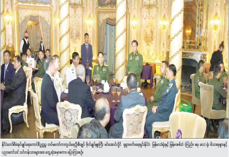 နိုင်ငံတော်စီမံ အုပ်ချုပ်ရေးကောင်စီဥက္ကဋ္ဌ၊ တပ်မတော်ကာကွယ်ရေး ဦးစီးချုပ် ဗိုလ်ချုပ်မှူးကြီး မင်းအောင်လှိုင် ဦးဆောင်သည့် ကိုယ်စားလှယ်အဖွဲ့သည် ရုရှားဖက်ဒရေးရှင်းနိုင်ငံ၊ ကာကွယ်ရေးဝန်ကြီး Army General Sergey Kuzhuge- tovich Shoigu က မော်စကိုမြို့ရှိ RADISSON Hotel ၌ တည်ခင်းဧည့်ခံသည့် (၉)ကြိမ်မြောက် နိုင်ငံတကာ လုံခြုံရေး ဆိုင်ရာညီလာခံ (Moscow Conference on International Security-2021(MCIS-2021)) အထိမ်းအမှတ် ဂုဏ်ပြုညစာစားပွဲသို့ ယမန်နေ့ ညပိုင်းတွင် ညီလာခံသို့တက်ရောက်ခဲ့ကြသည့် နိုင်ငံအသီးသီးမှ ကိုယ်စားလှယ်အဖွဲ့ဝင်များနှင့် အတူ တက်ရောက်သည်။
