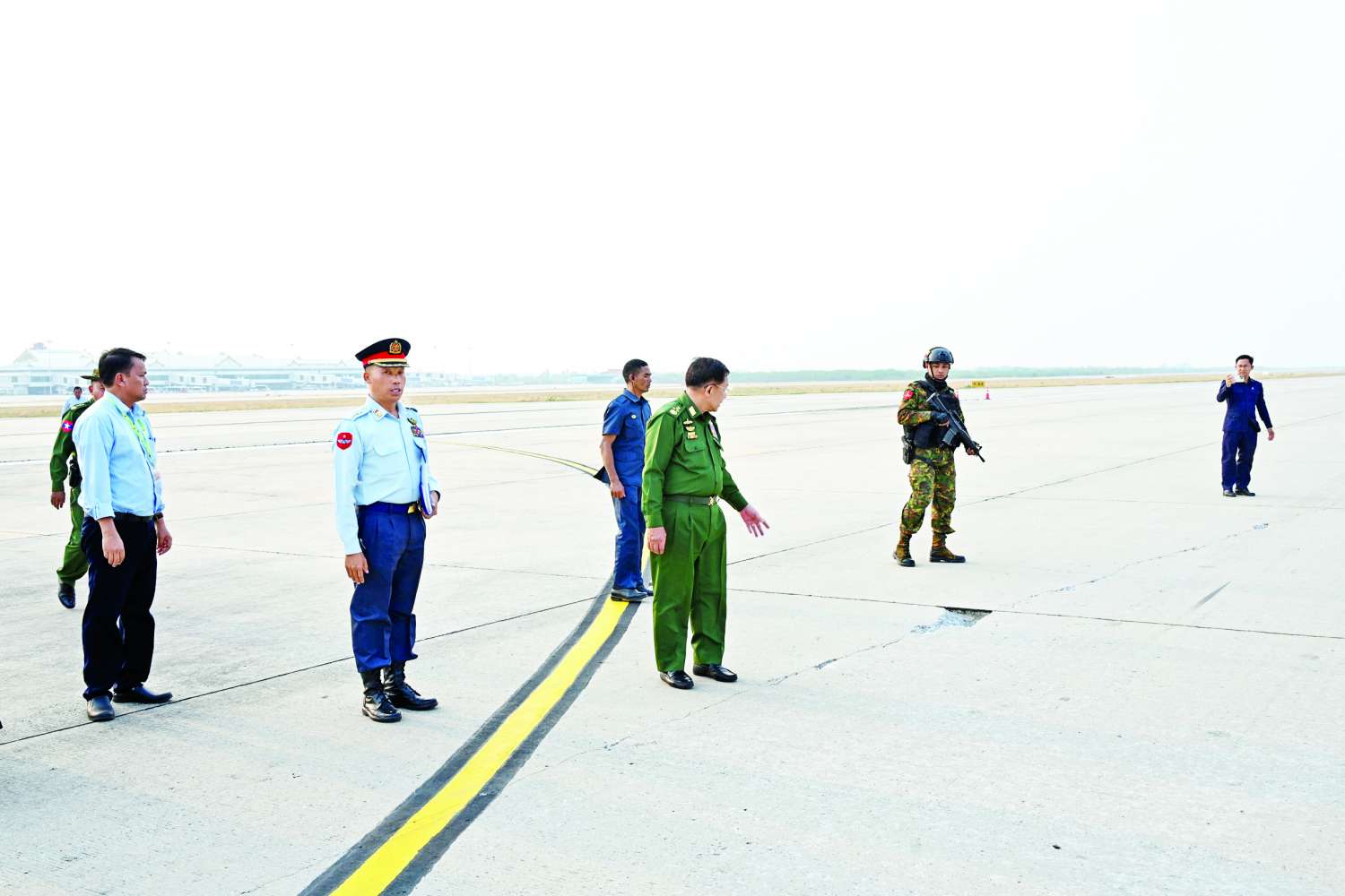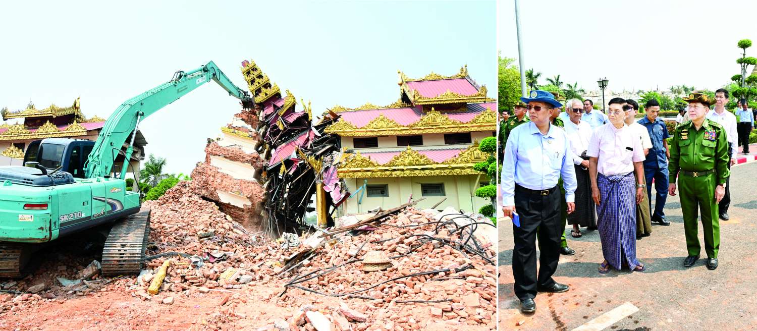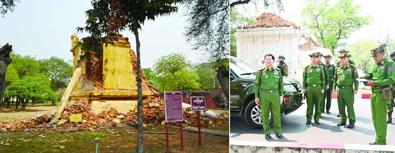 ယင်းနောက် နိုင်ငံတော်စီမံအုပ်ချုပ်ရေးကောင်စီဥက္ကဋ္ဌ နိုင်ငံတော်ဝန်ကြီးချုပ်သည် နန်းမြို့ရိုးအတွင်း ငလျင်ဘေးဒဏ်ကြောင့် ထိခိုက်ပျက်စီးခဲ့ရသည့် ရှေးဟောင်းအဆောက်အအုံများဖြစ်သော ပဟိုရ်စင်နှင့် စွယ်တော်စင်တို့အား ကြည့်ရှုစစ်ဆေးပြီး တာဝန်ရှိသူများ၏ တင်ပြချက်များ အပေါ် လိုအပ်သည်များ လမ်းညွှန်မှာကြားသည်။ ထို့နောက် နိုင်ငံတော်စီမံအုပ်ချုပ်ရေးကောင်စီဥက္ကဋ္ဌ နိုင်ငံတော်ဝန်ကြီးချုပ်နှင့် အဖွဲ့ဝင်များသည် စည်ရှည်တံခါးအနီး မြို့ရိုးနှင့် နန်းမြို့ရိုးတစ်လျှောက် ထိခိုက်ပျက်စီးနေမှုအခြေအနေများကို လိုက်လံကြည့်ရှုစစ်ဆေးခဲ့ပြီး လိုအပ်သည်များ လမ်းညွှန်မှာကြားသည်။