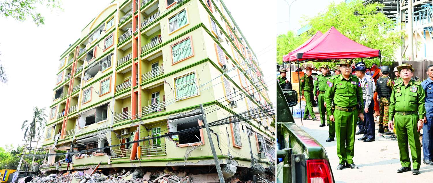 ထို့နောက် နိုင်ငံတော်စီမံအုပ်ချုပ်ရေးကောင်စီဥက္ကဋ္ဌ နိုင်ငံတော်ဝန်ကြီးချုပ်သည် အလယ်ပိုင်းတိုင်းစစ်ဌာနချုပ် အစည်းအဝေးခန်းမ၌ မန္တလေးတိုင်းဒေသကြီး ဝန်ကြီးချုပ် ဦးမျိုးအောင်၊ စစ်ကိုင်းတိုင်းဒေသကြီး ဝန်ကြီးချုပ် ဦးမြတ်ကျော်နှင့် တာဝန်ရှိသူများအား တွေ့ဆုံ၍ သက်ဆိုင်ရာတိုင်းဒေသကြီးအလိုက် သေဆုံး၊ ဒဏ်ရာရနှင့် ပျောက်ဆုံးစာရင်းများကို တိကျစွာရရှိနိုင်ရေး ဆက်လက်စိစစ်ကောက်ယူသွားရန်လိုကြောင်း၊ ထိခိုက်ဒဏ်ရာရရှိသူများကို ဆေးရုံ၊ ဆေးခန်းများ၊ ယာယီဆေးရုံများအားလုံး ဖြန့်ခွဲ၍ မြန်မြန်ဆန်ဆန် ဆေးဝါးကုသမှု ဆောင်ရွက်ပေးနိုင်ရန်လိုကြောင်း၊ တပ်ဘက်၊ အရပ်ဘက်ဆေးရုံများအားလုံး၊ ကျန်းမာရေးဝန်ထမ်းများအားလုံးက တက်ညီလက်ညီဖြင့် ဖိဖိစီးစီးဆောင်ရွက်ပေးသွားနိုင်ရန်လိုကြောင်း၊ ပြိုကျပျက်စီးသွားသော အဆောက်အအုံများနှင့် ပြိုကျပျက်စီးနေဆဲ အဆောက်အအုံများကို အမြန်ဆန်ဆုံး စနစ်တကျဖြင့် ဖယ်ရှားရှင်းလင်းနိုင်ရန် လိုကြောင်း၊ ထိုသို့ဆောင်ရွက်နိုင်မှသာလျှင် ဘေးပတ်ဝန်းကျင်၌လည်း ဘေးအန္တရာယ်ကင်းရှင်းစေမည်ဖြစ်ကြောင်း၊ ယာယီနေထိုင်ရေးနေရာများ၌ နေထိုင်နေရသူများကိုလည်း စနစ်တကျ ရှိစေရေး ဆောင်ရွက်ပေးနိုင်ရန်လိုကြောင်း၊ ပျက်စီးဆုံးရှုံးခဲ့ရသည့် မန္တလေးတက္ကသိုလ် ပင်မဆောင် ကြီးကို မူလလက်ရာမပျက် အမြန်ဆုံးပြန်လည်တည်ဆောက်နိုင်ရန်လိုပြီး ခိုင်ခံ့မှုရှိရန်နှင့် ဘေးအန္တရာယ်ကင်းရှင်းမှုရှိသည့် ဒီဇိုင်းဖြစ်စေရေး စနစ်တကျ ဆောင်ရွက်သွားရန်လိုကြောင်း၊ ငလျင်ဘေးဒဏ်သင့်ခဲ့ရသည့် ပြည်သူများအတွက် စားရေး၊ နေရေးနှင့် အခြားလူမှုကိစ္စရပ်များ အဆင်ပြေစေရေးအတွက်လည်း စီစဉ်ဆောင်ရွက်ပေးသွားရမည် ဖြစ်ကြောင်း။