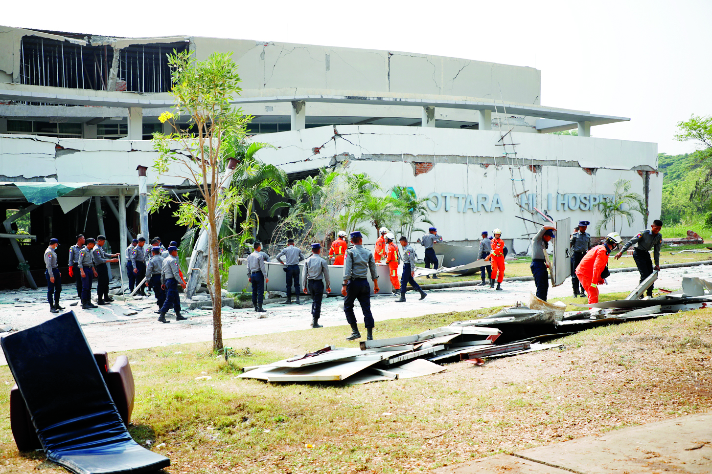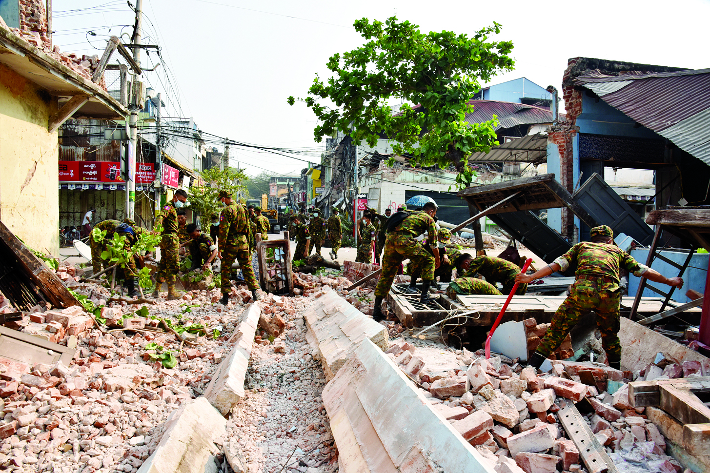 အဆိုပါ ငလျင်ဒဏ်သင့်ဒေသအသီးသီး၌ ကူညီကယ်ဆယ်ရေးလုပ်ငန်းများကို တိုင်းစစ်ဌာနချုပ်အသီးသီးမှ တပ်မတော်သားများ၊ မြန်မာနိုင်ငံရဲတပ်ဖွဲ့ဝင်များ၊ မီးသတ်တပ်ဖွဲ့ဝင်များ၊ ဌာနဆိုင်ရာဝန်ထမ်းများ၊ လူမှုကူညီရေးအသင်းအဖွဲ့များနှင့် ဒေသခံပြည်သူများ ပူးပေါင်း၍ အချိန်နှင့်တစ်ပြေးညီ ကူညီဆောင်ရွက်ပေးလျက်ရှိရာ ယနေ့တွင် နေပြည်တော်ကောင်စီနယ်မြေအတွင်းရှိ ငလျင်ဒဏ်သင့်နေရာများ၊ ရှမ်းပြည်နယ် (တောင်ပိုင်း) ညောင်ရွှေမြို့နယ် ကေလာကျေးရွာအုပ်စုနှင့် နန့်ပန်ကျေးရွာအုပ်စု နန့်ပန်ကျေးရွာရှိ အလိုတော်ပေါက်ဘုရား၊ သာလေးကျေးရွာအုပ်စု နန်းဟူးကျေးရွာရှိ ဖောင်တော်ဦးဘုရားစသည့်ငလျင်ဒဏ်ကြောင့် ပြိုကျပျက်စီးခဲ့သည့်နေရာများ၊ မန္တလေးတိုင်းဒေသကြီး အောင်မြေသာစံမြို့နယ် အနှိပ်တော် ရပ်ကွက်ရှိ အဆောက်အအုံ၊ မန္တလေးတက္ကသိုလ်ရှိ အဆောက်အအုံများ၊ ဦးလှသိန်းဓမ္မဗိမာန်၊ ငလျင်ဒဏ်ကြောင့် ထိခိုက်ပျက်စီးခဲ့သည့် ရန်ကုန်-မန္တလေးအမြန်လမ်းရှိ လမ်း/ တံတားများ၊ ပဲခူးတိုင်းဒေသကြီး တောင်ငူမြို့ရှိ ဝေဠုဝန်ရိပ်သာကျောင်းတိုက်၊ တောင်ငူမြို့နယ်အတွင်းရှိ သမိုင်းဝင်ရွှေဆံတော်စေတီတော်မြတ်ကြီး၊ ကန်သာဗလီဝတ်ပြုကျောင်း၊ သမိုင်းဝင်မဟာအောင်မြေရှိ ကောင်းမှုတော်စေတီတော်မြတ်ကြီးနှင့် သမိုင်းဝင်လောကမာရဇိန် နန်းတော်ဦးစေတီတော်မြတ်ကြီးတို့၌ ကူညီကယ်ဆယ်ရေးလုပ်ငန်းများ ဆောင်ရွက်ပေးပြီး ဒဏ်ရာရရှိကြသည့် ဒေသခံပြည်သူများအား ဆေးကုသရေးလုပ်ငန်းများ ဆောင်ရွက်ပေးသည်။