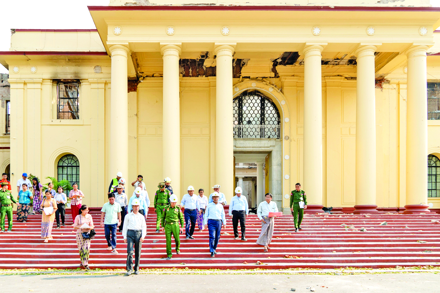 ဆက်လက်၍ ကာကွယ်ရေးဦးစီးချုပ်ရုံး (ကြည်း) မှ ဒုတိယဗိုလ်ချုပ်ကြီး မျိုးမိုးအောင်နှင့် မန္တလေးတိုင်းဒေသကြီးဝန်ကြီးချုပ်တို့က အဆောက်အအုံများ၏ လက်ရှိပျက်စီးမှုများအား ဝိုင်းဝန်းရှင်းလင်းဆောင်ရွက်ရန် စီစဉ်ထားရှိမှုနှင့်စပ်လျဉ်း၍ အန္တရာယ်ကင်းရှင်းအောင် စက်ယန္တရားများ အသုံးပြုဆောင်ရွက်ရန်တို့ကို ဖြည့်စွက်မှာကြားကာ ပျက်စီးသွားသော အဆောက်အအုံများအား အသေးစိတ် လိုက်လံကြည့်ရှုစစ်ဆေးခဲ့ကြသည်။