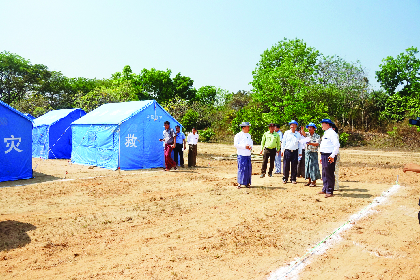 ဆက်လက်၍ နေပြည်တော်ကောင်စီဥက္ကဋ္ဌနှင့် တာဝန်ရှိသူများသည် ဇမ္ဗူသီရိမြို့နယ်ရှိ ဝန်ထမ်းအိမ်ရာလိုင်းခန်းများမှ ငလျင်ဘေးသင့်ဝန်ထမ်းများနှင့် မိသားစုဝင်များနေထိုင်ရန်အတွက် နေပြည်တော် စည်ပင်သာယာရေးကော်မတီ ပန်းဥယျာဉ်နှင့် အားကစားကွင်းဌာနမှ ဝဏ္ဏသိဒ္ဓိအားကစားကွင်း၊ သုခသိဒ္ဓိအားကစားကွင်း၊ ဉာဏသိဒ္ဓိအားကစားကွင်း၊ ဓနသိဒ္ဓိအားကစားကွင်းနှင့် ဗလသိဒ္ဓိအားကစားကွင်းတို့၌ ယာယီတဲများ တည်ဆောက်နေမှု အခြေအနေများကို ကြည့်ရှုစစ်ဆေးသည်။ ထို့နောက် သက်ဆိုင်ရာတာဝန်ရှိသူများက လုပ်ငန်းများ ဆောင်ရွက်နေမှု၊ ရေရရှိရေးဆောင်ရွက်နေမှုနှင့် နေရာချထားမည့် အစီအမံများအား ရှင်းလင်းတင်ပြကြရာ နေပြည်တော်ကောင်စီဥက္ကဋ္ဌက လိုအပ်သည်များကို ပေါင်းစပ်ညှိနှိုင်း ဆောင်ရွက်ပေးသည်။