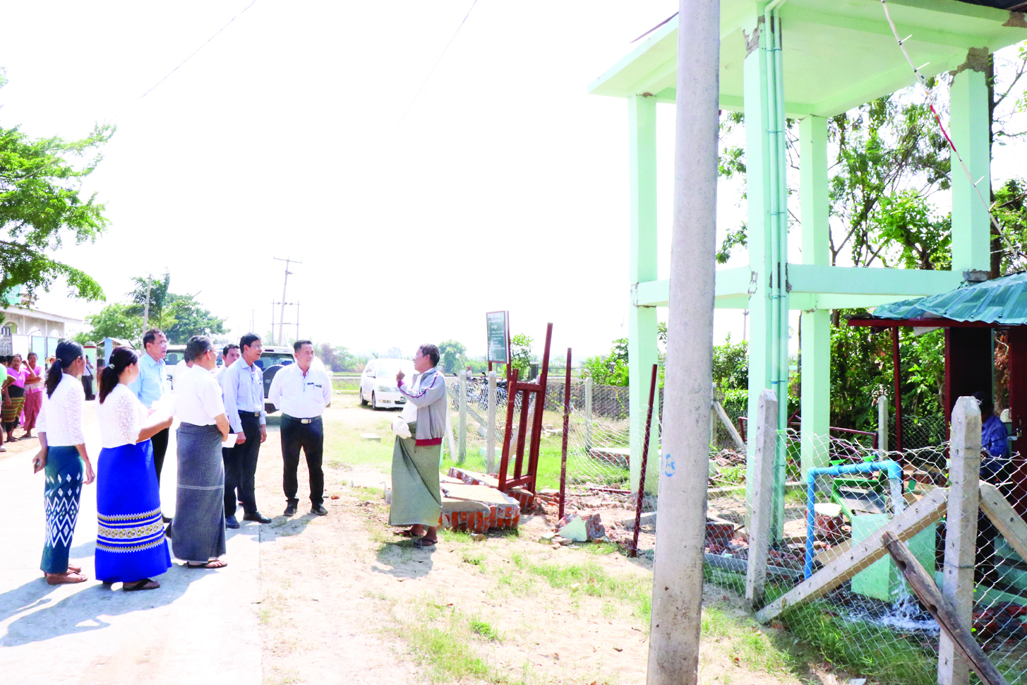 ဆက်လက်၍ လယ်ဝေးမြို့နယ် ညိုပင်ကျေးရွာအုပ်စု ကွေ့ကြီးကျေးရွာရှိ အမြင့်တင်ရေစင် ငလျင်ကြောင့် ထိခိုက်မှုအခြေအနေကို ကြည့်ရှုစစ်ဆေးပြီး ရေစင်ပြန်လည်တည်ဆောက်ရေးနှင့် စပ်လျဉ်း၍ လိုအပ်သည်များ ညှိနှိုင်းပေါင်းစပ်ဆောင်ရွက်ပေးသည်။