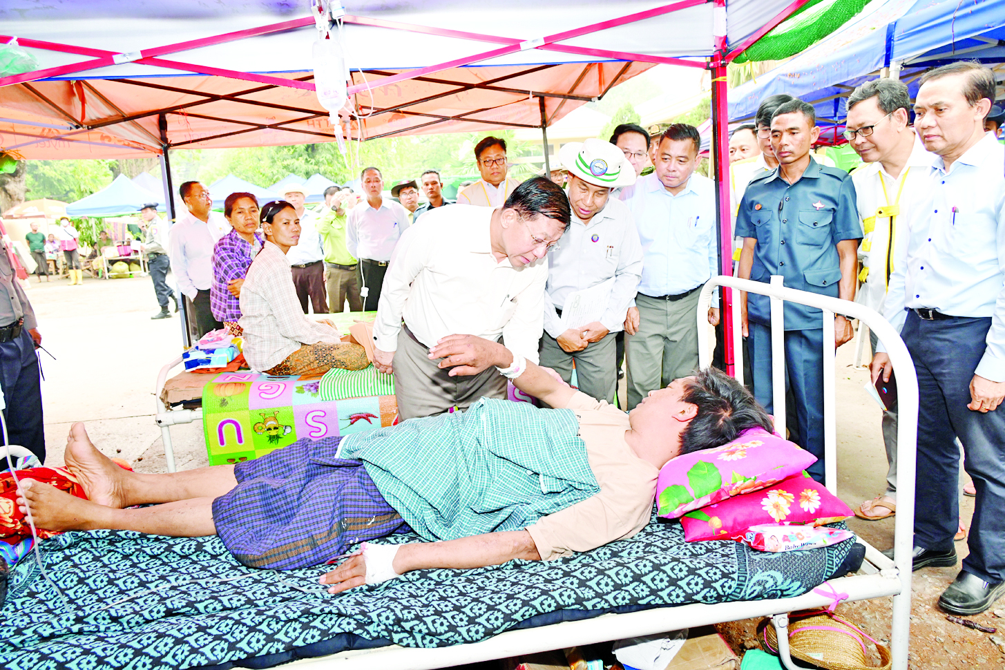 ထို့နောက် နိုင်ငံတော်စီမံအုပ်ချုပ်ရေးကောင်စီဥက္ကဋ္ဌ နိုင်ငံတော်ဝန်ကြီးချုပ်နှင့် အဖွဲ့ဝင်များသည် စစ်ကိုင်းမြို့ ပြည်သူ့ဆေးရုံကြီးသို့ ရောက်ရှိကြပြီး ငလျင်ဘေးဒဏ်ကြောင့် ထိခိုက်ဒဏ်ရာရရှိခဲ့သူများအား ဆေးဝါးကုသမှုဆောင်ရွက်ပေးနေမှုများ၊ အဆောက်အအုံအတွင်း ခြောက်ရက်ကြာပိတ်မိခဲ့ပြီး အသက်ရှင်လျက်ကယ်ထုတ်နိုင်ခဲ့သူ ကျောင်းဆရာတစ်ဦးအပါအဝင် အခြားထိခိုက်ဒဏ်ရာရရှိခဲ့သည့် လူနာများအား လိုအပ်သည့် ကျန်းမာရေးစောင့်ရှောက်မှု ဆောင်ရွက်ပေးထားမှုများကိုကြည့်ရှု၍ အားပေးစကားပြောကြားကာ ထိခိုက်ဒဏ်ရာရရှိသူများအတွက် ထောက်ပံ့ငွေများနှင့် ကျန်းမာရေးဝန်ထမ်းများအတွက် ချီးမြှင့်ငွေများကို ပေးအပ်သည်။