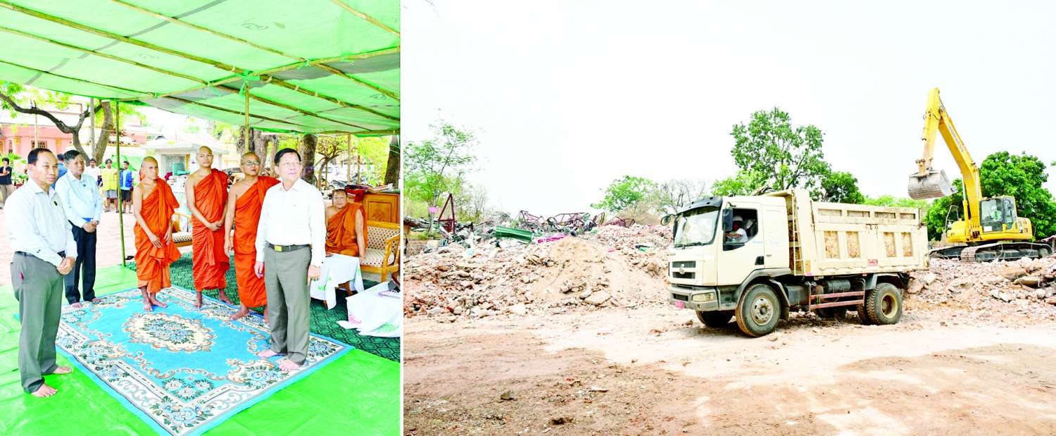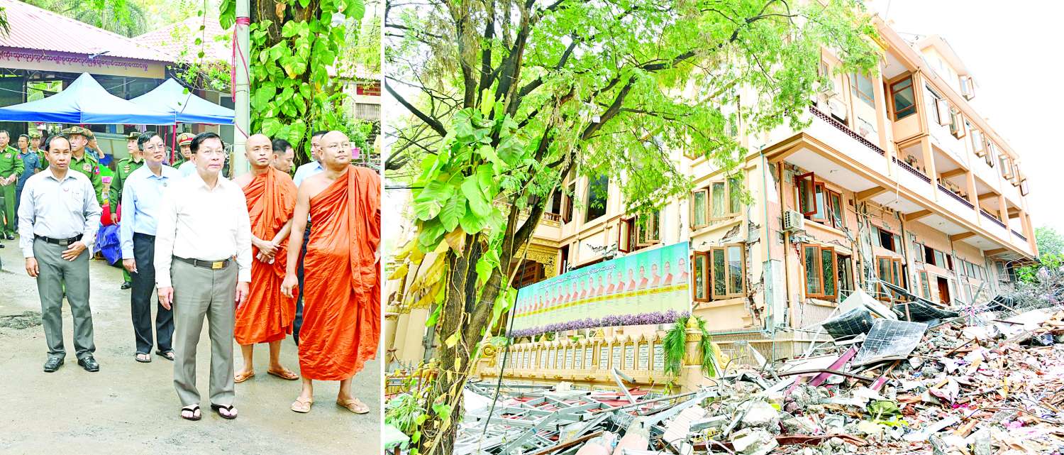 ယင်းနောက် နိုင်ငံတော်စီမံအုပ်ချုပ်ရေးကောင်စီဥက္ကဋ္ဌ နိုင်ငံတော်ဝန်ကြီးချုပ်နှင့် အဖွဲ့ဝင်များသည် လေးကျွန်းမြေအုဌ်ကျောင်း၌ အဆောက်အအုံပျက်စီးနေမှုအား ရှင်းလင်းဖယ်ရှားခြင်း ဆောင်ရွက်နေမှု၊ သကျဓီတာသီလရှင်စာသင်တိုက် အဆောက်အအုံပျက်စီးနေမှုအား ရှင်းလင်းဖယ်ရှားခြင်းဆောင်ရွက်နေမှု၊ ဆွမ်းဦးပုညရှင် စေတီတော်တွင် အဆောက်အအုံပျက်စီးနေမှုအား ရှင်းလင်းဖယ်ရှားခြင်းဆောင်ရွက်နေမှု၊ ရတနာသိင်္ဂီ သီလရှင်စာသင်တိုက်တွင် အဆောက်အအုံပျက်စီးနေမှုအား ရှင်းလင်းဖယ်ရှားခြင်း ဆောင်ရွက်နေမှုတို့ကို လိုက်လံကြည့်ရှုစစ်ဆေးပြီး တာဝန်ရှိသူများ၏ တင်ပြချက်များအပေါ် သာသနိကအဆောက်အအုံများအား မူလလက်ရာမပြတ် ခိုင်ခံ့စွာဖြင့် ပြန်လည်တည်ထားကိုးကွယ်နိုင်ရေး၊ လုပ်ငန်းဆောင်ရွက်မှုများကို အဆင့်အလိုက် စနစ်တကျဖြင့် ဆောင်ရွက်သွားရန်နှင့်အခြားလိုအပ်သည်များကိုမှာကြားကာ ကူညီကယ်ဆယ်ရေးအဖွဲ့များအား ရင်းရင်းနှီးနှီးအားပေးစကားပြောကြားပြီး ချီးမြှင့်ငွေများပေးအပ်သည်။