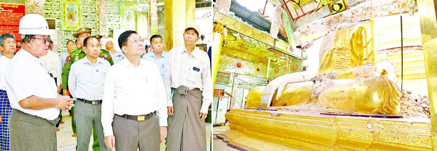 ထို့နောက် နိုင်ငံတော်စီမံအုပ်ချုပ်ရေးကောင်စီဥက္ကဋ္ဌ နိုင်ငံတော်ဝန်ကြီးချုပ်နှင့် အဖွဲ့ဝင်များသည် စစ်ကိုင်းမြို့ ရိုင်တန်းရပ်ကွက်ရှိ မဟာစေတီတော်အား လုံးတော်ပြည့်ငုံ၍ ပြုပြင်မွမ်းမံတည်ဆောက်နေမှုနှင့် ငလျင်ဘေးဒဏ်ကြောင့် ထိခိုက်ပျက်စီးခဲ့ရမှုများကို ကြည့်ရှုကာ ရေရှည်တည်တံ့ခိုင်မြဲရေးအတွက် ပြုပြင်မွမ်းမံမှုများကို စနစ်တကျတွက်ချက် ဆောင်ရွက်သွားရန်နှင့် အခြားလိုအပ်သည်များကို မှာကြားသည်။
