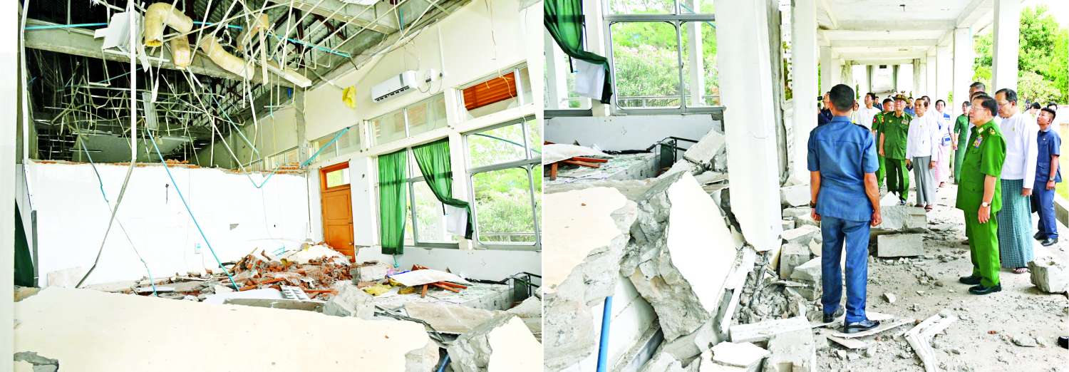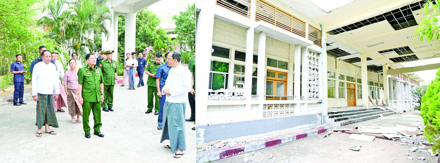 ထိုသို့ ကြည့်ရှုစစ်ဆေးရာတွင် နိုင်ငံတော်စီမံအုပ်ချုပ်ရေးကောင်စီဥက္ကဋ္ဌ နိုင်ငံတော်ဝန်ကြီးချုပ်နှင့်အဖွဲ့ဝင်များသည် ဆေးရုံကြီးအတွင်းရှိ ဆေးကုသဆောင်များ၊ အထူးကြပ်မတ်ကုသဆောင်များ၊ ဝန်ထမ်းအိမ်ရာများ၊ ခွဲစိတ်ကုသဆောင်များအား လှည့်လည်ကြည့်ရှု၍ ငလျင်ဒဏ်ကြောင့် အဆောက်အအုံထိခိုက်ပျက်စီးခဲ့မှုများကို ကြည့်ရှုစစ်ဆေးရာ ကျန်းမာရေးဝန်ကြီးဌာန ပြည်ထောင်စုဝန်ကြီးနှင့် တာဝန်ရှိသူများက လိုက်လံရှင်းလင်းတင်ပြကြသည်။