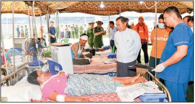 ဆက်လက်၍ နိုင်ငံတော်စီမံအုပ်ချုပ်ရေးကောင်စီ ဒုတိယဥက္ကဋ္ဌ ဒုတိယဝန်ကြီးချုပ်နှင့် အဖွဲ့ဝင်များသည် ပျဉ်းမနားမြို့ ပေါင်းလောင်းအားကစားကွင်း၌ ဖွင့်လှစ်ထားရှိသည့် ယာယီဆေးရုံ (ပေါင်းလောင်း) ၌ တက်ရောက်ဆေးကုသမှု ခံယူလျက်ရှိသည့် ငလျင်ဒဏ်ကြောင့် ထိခိုက်ဒဏ်ရာရရှိခဲ့သော အရပ်သားပြည်သူများ အား သွားရောက်ကြည့်ရှု၍ ထိခိုက်ဒဏ်ရာရရှိမှုအခြေအနေများ၊ ကျန်းမာရေးစောင့်ရှောက် ပေးနေမှုအခြေအနေများ၊ ရောဂါသက်သာပျောက်ကင်းမှု အခြေ အနေများကို တစ်ဦးချင်းရင်းရင်း နှီးနှီး လိုက်လံမေးမြန်းကာ အားပေးစကား ပြောကြားသည်။