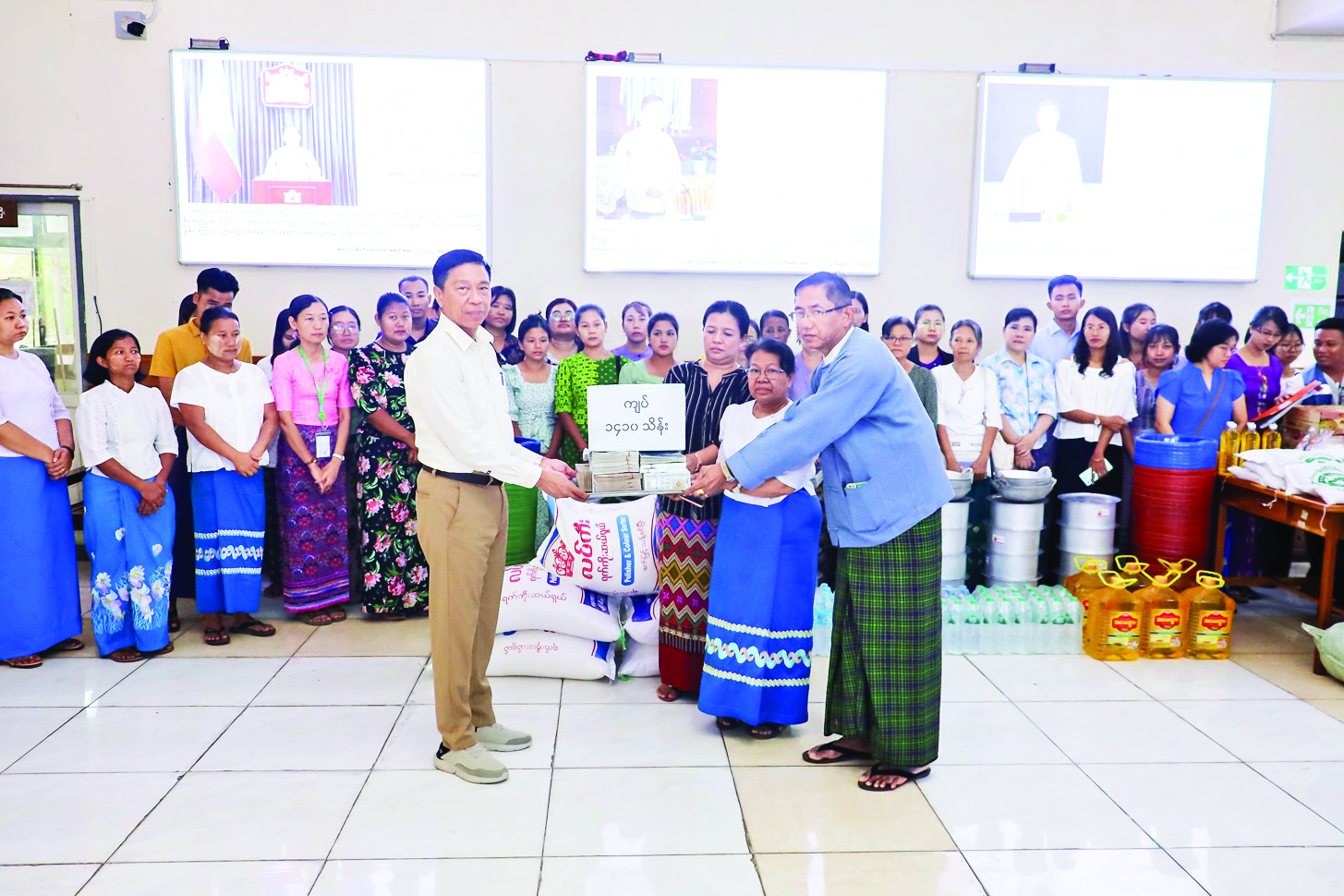 မတ် ၂၈ ရက်က မန္တလေး ငလျင်ဒဏ်ခံစားခဲ့ရသော လူမှုဝန်ထမ်း၊ ကယ်ဆယ်ရေးနှင့် ပြန်လည်နေရာချထားရေးဝန်ကြီးဌာန ဝန်ကြီးရုံး၊ လူမှုဝန်ထမ်းဦးစီးဌာန၊ ဘေးအန္တရာယ်ဆိုင်ရာ စီမံခန့်ခွဲမှုဦးစီးဌာနနှင့် ပြန်လည်ထူထောင်ရေးဦးစီးဌာနတို့မှ ဝန်ထမ်းများအတွက် ရုံးအမှတ် (၂၃) လူမှုဝန်ထမ်း၊ ကယ်ဆယ်ရေးနှင့် ပြန်လည်နေရာချထားရေးဝန်ကြီးဌာန ပြည်ထောင်စုဝန်ကြီး ဒေါက်တာစိုးဝင်းမိသားစုနှင့် အလှူရှင်များ ကလှူဒါန်းထားသည့်အလှူငွေကျပ် ၁၄၁၀၀၀၀၀ဝ အမျိုးသမီးအသုံးအဆောင် ပစ္စည်း၂ ၁ မျိုး၊ စားသုံးဆီ၊ ဆန်၊ ဒန်အိုး၊ စတီး ပန်းကန်၊ စတီးဇွန်း၊ ရေဇလုံ၊ မုန့်မျိုးစုံ၊ ခေါက်ဆွဲခြောက်ထုပ်နှင့် ရေသန့်ကတ်များ ပေးအပ်ခြင်းကို လူမှုဝန်ထမ်း၊ ကယ်ဆယ်ရေးနှင့် ပြန်လည်နေရာချထားရေးဝန်ကြီးဌာန၌ ကျင်းပခဲ့ရာ ပြည်ထောင်စုဝန်ကြီးက ဝန်ကြီးရုံးနှင့် ဦးစီးဌာနသုံးခုတို့မှ တာဝန်ရှိသူများသို့ ပေးအပ်သည်။