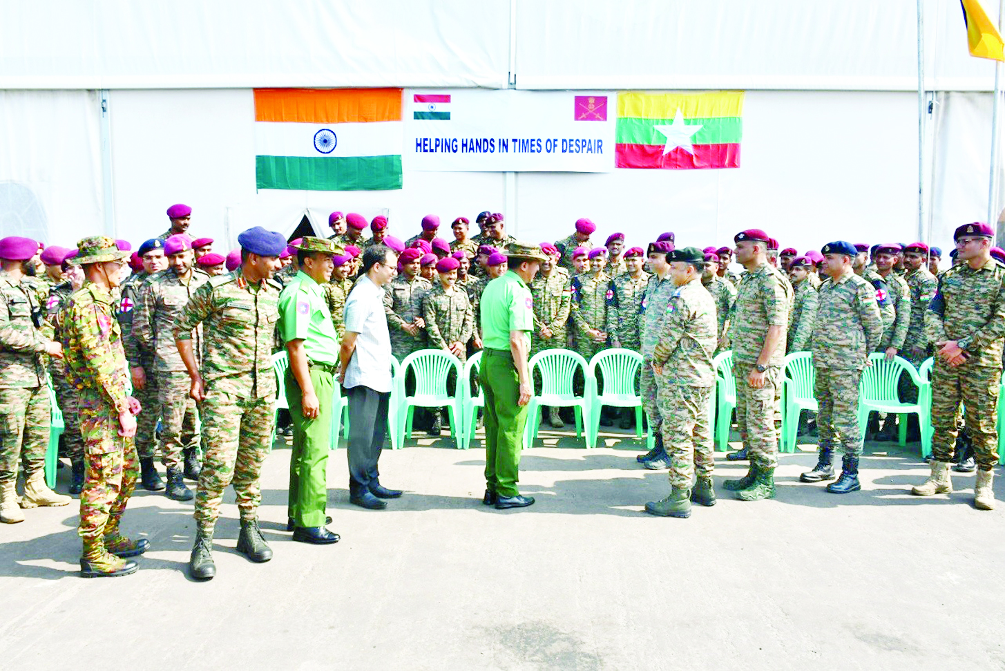 မန္တလေးတိုင်းဒေသကြီး ချမ်းမြသာစည်မြို့နယ် လေဆိပ်ဟောင်းနေရာ၌ အခြေပြု၍ ငလျင်ဒဏ်ကြောင့် ထိခိုက်ဒဏ်ရာရရှိသူများအား ယာယီဆေးရုံဖွင့်လှစ်ကာ ဆေးကုသမှုများ ဆောင်ရွက်ပေးခဲ့ပြီး ပြန်လည်ထွက်ခွာကြမည့် Lt. Col. Jagneet Gill ဦးဆောင်သည့် အိန္ဒိယတပ်မတော်ဆေးကုသရေးအဖွဲ့အား ယနေ့နံနက်ပိုင်းတွင် ကာကွယ်ရေးဦးစီးချုပ်ရုံး(ကြည်း)မှ ဒုတိယဗိုလ်ချုပ်ကြီးမျိုးမိုးအောင်၊ အလယ်ပိုင်းတိုင်းစစ်ဌာနချုပ် တိုင်းမှူးဗိုလ်မှူးချုပ်ကျော်ကိုထိုက်နှင့် တာဝန်ရှိသူများက သွားရောက်တွေ့ဆုံနှုတ်ဆက်သည်။