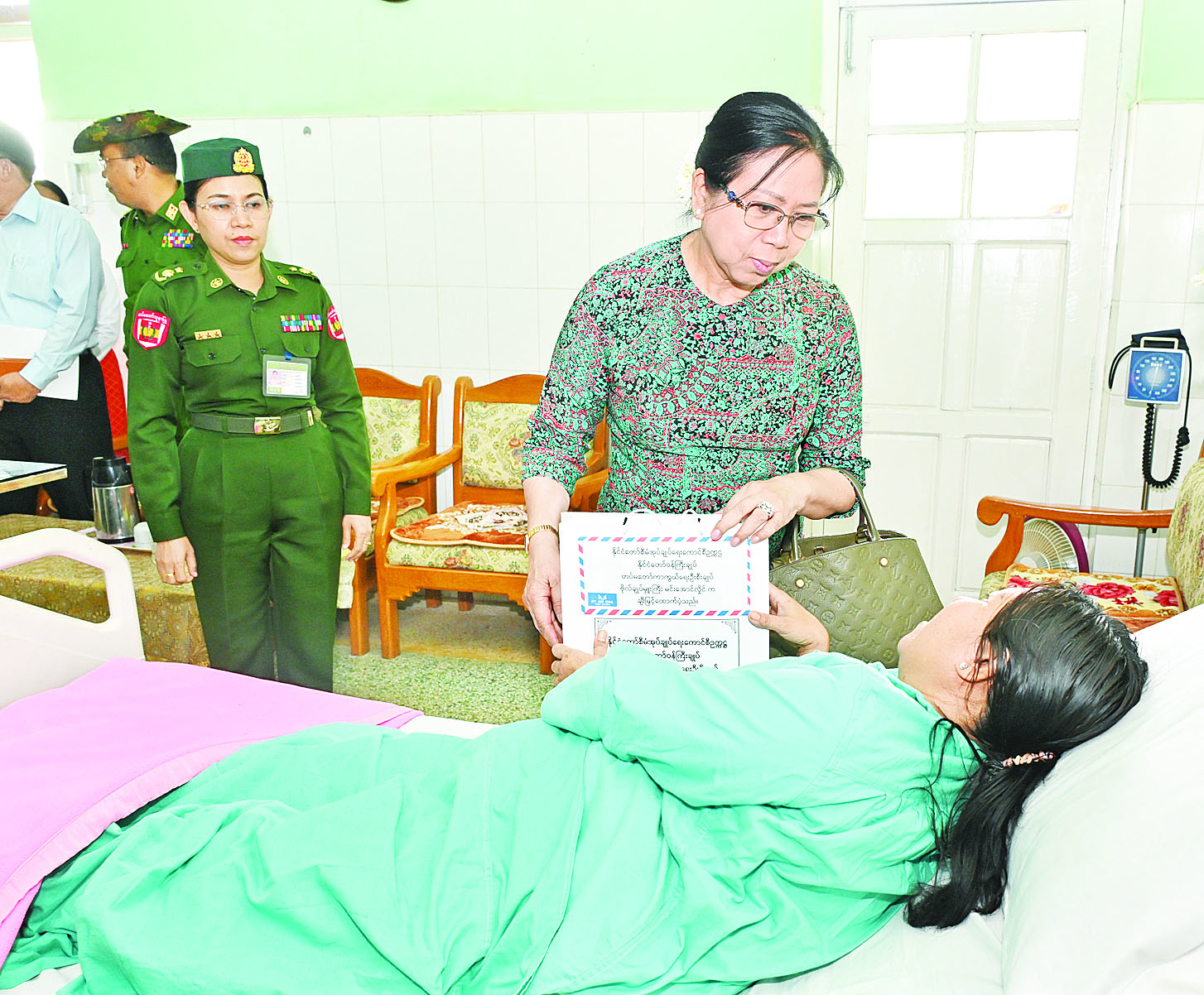 ယင်းနောက် နိုင်ငံတော်စီမံအုပ်ချုပ်ရေးကောင်စီဥက္ကဋ္ဌ နိုင်ငံတော်ဝန်ကြီးချုပ်နှင့်ဇနီး၊ အဖွဲ့ဝင်များသည် ဆေးရုံတက်ရောက်ကုသမှုခံယူလျက်ရှိသည့် အရာရှိ၊ စစ်သည်များအား ဂုဏ်ပြုချီးမြှင့်ငွေနှင့် လက်ဆောင်ပစ္စည်းများပေးအပ်သည်။