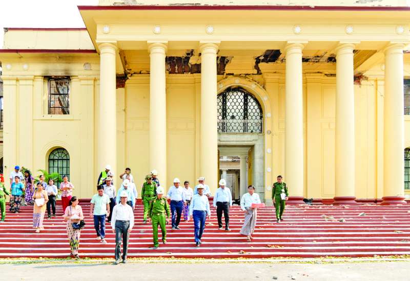 အလွန်အင်အားပြင်းထန်သည့် ငလျင်လှုပ်ခတ်ခဲ့မှုကြောင့် ငလျင်ဘေးဒဏ်သင့်ခဲ့ရသည့်ဒေသများ၌ ကူညီကယ်ဆယ်ရေးနှင့် ပြန်လည်ထူထောင်ရေးလုပ်ငန်းများ အမြန်ဆုံးဆောင်ရွက်သွားနိုင်ရေး အထူးအစည်းအဝေးတစ်ရပ်ကို ယနေ့နံနက်အစောပိုင်းတွင် တပ်မတော်ကာကွယ်ရေးဦးစီးချုပ်ရုံး ဧည့်ခန်း၌ ကျင်းပပြုလုပ်ပြီး နိုင်ငံတော်စီမံအုပ်ချုပ်ရေးကောင်စီဥက္ကဋ္ဌ နိုင်ငံတော်ဝန်ကြီးချုပ် ဗိုလ်ချုပ်မှူးကြီး မင်းအောင်လှိုင်က လိုအပ်သည်များ လမ်းညွှန်မှာကြားသည်။