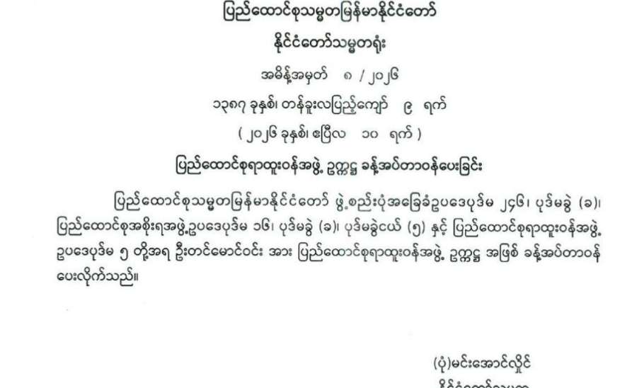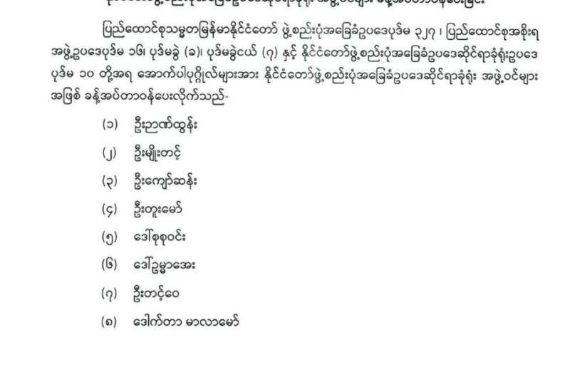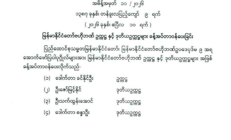 မြန်မာနိုင်ငံတော်ဗဟိုဘဏ်ဥက္ကဋ္ဌနှင့် ဒုတိယဥက္ကဋ္ဌများ ခန့်အပ်တာဝန်ပေးခြင်း