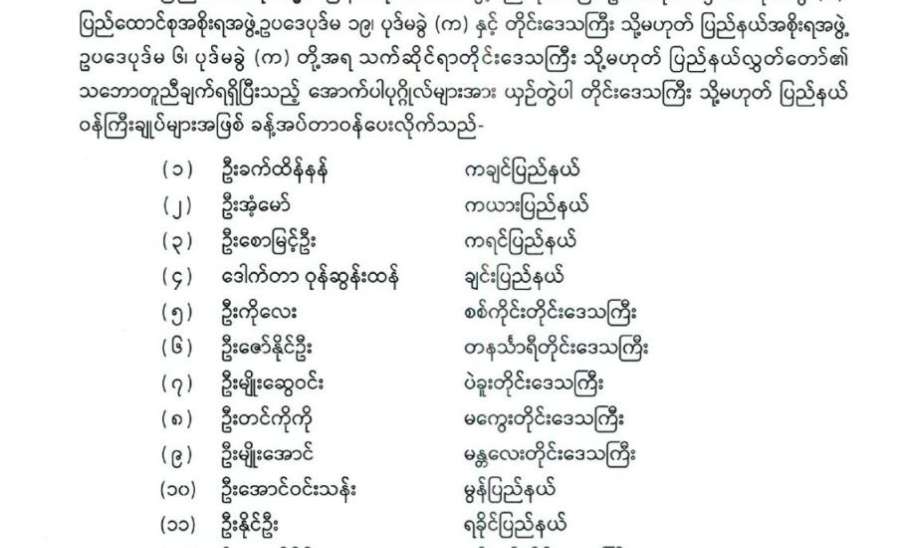 တိုင်းဒေသကြီး သိုမဟုတ် ပြည်နယ်ဝန်ကြီးချုပ်များ ခန့်အပ်တာဝန်ပေးခြင်း