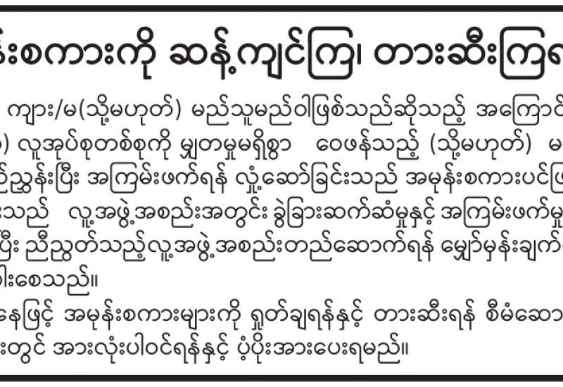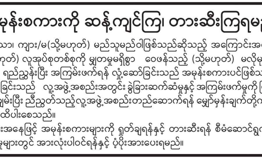 Oct 24, 2025စာအုပ်စာပေလေ့လာဖတ်ရှုခြင်း၏ အကျိုးကျေးဇူးများနှင့်ပတ်သက်၍ ပြည်တွင်း၊ ပြည်ပစာဆိုပညာရှင်ကြီးများ၏ အဆိုအမိန့်များစွာရှိပါသည်။ လက်လှမ်းမီရာ စာဆိုပညာရှင်ကြီးများ၏ အဆိုအမိန့်များအနက် စာရေးဆရာ၊ သတင်းစာဆရာကြီး သခင်အောင်ဖေ၏ “သင်အလိမ်မခံချင်လျှင် စာဖတ်ပါ” ဟူသော အဆိုအမိန့်ကို မှတ်မှတ်ထင်ထင် သဘောကျမိသည်။