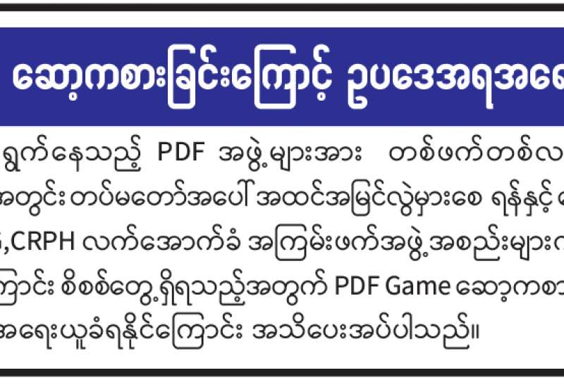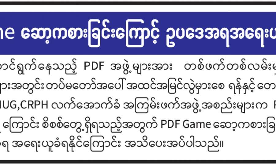 အကြမ်းဖက်လုပ်ငန်းများဆောင်ရွက်နေသည့် PDF အဖွဲ့များအားတစ်ဖက်တစ်လမ်းမှ ထောက်ပံ့လှူဒါန်းစေရန်၊ လူငယ်လူရွယ်များ၏မသိစိတ်များအတွင်း တပ်မတော်အပေါ်အထင်အမြင်လွဲမှားစေရန်နှင့် တော်လှန်လိုစိတ်တိုးပွားလာစေရန်စသည့်ရည်ရွယ်ချက်များဖြင့် NUG,CRPH လက်အောက်ခံ အကြမ်းဖက်အဖွဲ့အစည်းများက PDF Game Application များ တီထွင်ဖန်တီးအသုံးပြုလျက်ရှိကြောင်း စိစစ်တွေ့ရှိရသည့်အတွက် PDF Game ဆော့ကစားခြင်းသည် အကြမ်းဖက်အဖွဲ့အား ထောက်ပံ့ခြင်းဖြစ်၍ ဥပဒေအရ အရေးယူခံရနိုင်ကြောင်း အသိပေးအပ်ပါသည်။