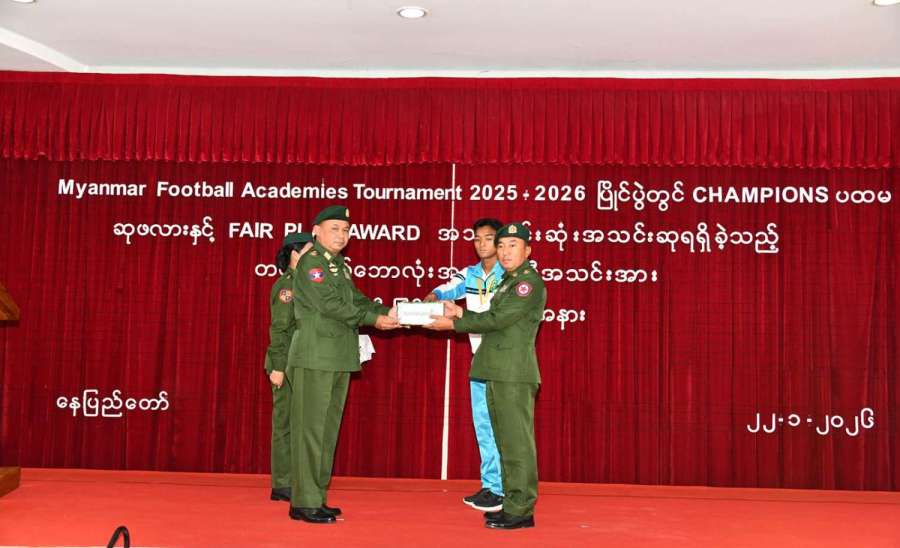 Myanmar Football Academies Tournament 2025-2026 ပြိုင်ပွဲတွင် ပထမဆုနှင့် အသန့်ရှင်းဆုံးအသင်းဆု (Fair Play Award) ရရှိခဲ့သည့် တပ်မတော်ဘောလုံးအကယ်ဒမီ အသင်းအား ဂုဏ်ပြုချီးမြှင့်ခြင်းအခမ်းအနားကို ယနေ့မွန်းလွဲပိုင်းတွင် နေပြည