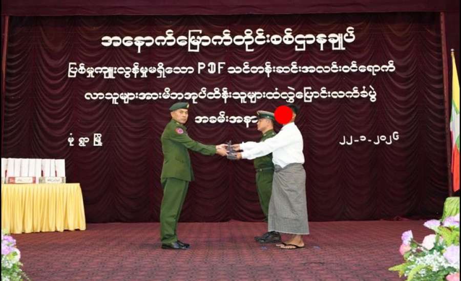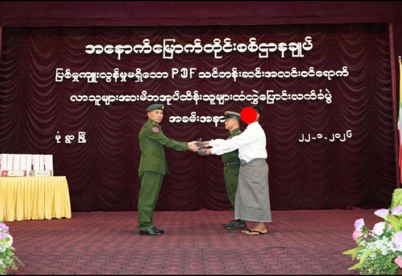 နိုင်ငံတော်နှင့် တပ်မတော်၏ ငြိမ်းချမ်းရေးလုပ်ငန်းစဉ်များကို လက်ခံယုံကြည်သည့် PDF အမည်ခံအဖွဲ့ဝင် အမျိုးသား ၂၂ ဦးနှင့် အမျိုးသမီး ၂ ဦးတို့သည် လက်နက်၊ ခဲယမ်းများနှင့်အတူ ဥပဒေဘောင်အတွင်းသို့ ဝင်ရောက်