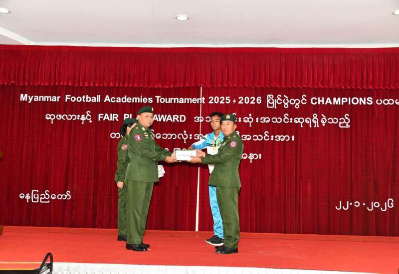 Myanmar Football Academies Tournament 2025-2026 ပြိုင်ပွဲတွင် ပထမဆုနှင့် အသန့်ရှင်းဆုံးအသင်းဆုရရှိခဲ့သည့် တပ်မတော်ဘောလုံးအကယ်ဒမီအသင်းအား ဂုဏ်ပြုချီးမြှင့်ခြင်းအခမ်းအနား ကျင်းပ