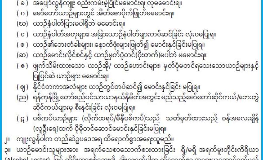 မြန်မာသက္ကရာဇ် ၁၃၈၇ ခုနှစ် တန်ခူးလဆုတ် (၁၂) ရက်နေ့မှ ကဆုန်လဆန်း (၁) ရက်နေ့အထိ (၂၀၂၆ ခုနှစ် ဧပြီလ ၁၃ ရက်နေ့မှ ၁၆ ရက်နေ့အထိ) မြန်မာ့ရိုးရာမဟာသင်္ကြန်ပွဲတော်တွင် ယာဉ်မောင်းသူများမှ သတိပြုရန်အချက်များ