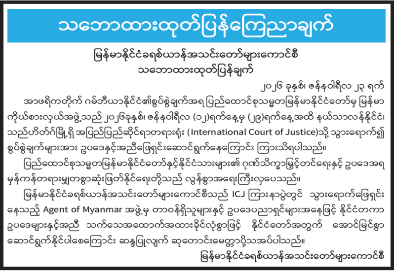 မြန်မာ-အိန္ဒိယချစ်ကြည်ရေးအသင်း (MIFA) ဗဟိုအလုပ်အမှုဆောင်အဖွဲ့၏ သဘောထားထုတ်ပြန်ကြေညာချက်