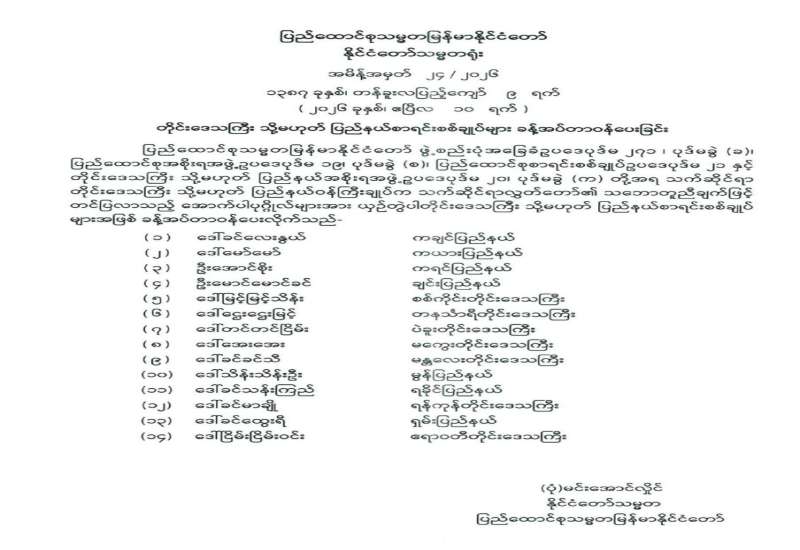 တိုင်းဒေသကြီး သို့မဟုတ် ပြည်နယ်တရားလွှတ်တော် တရားသူကြီးများ ခန့်အပ်တာဝန်ပေးခြင်း
