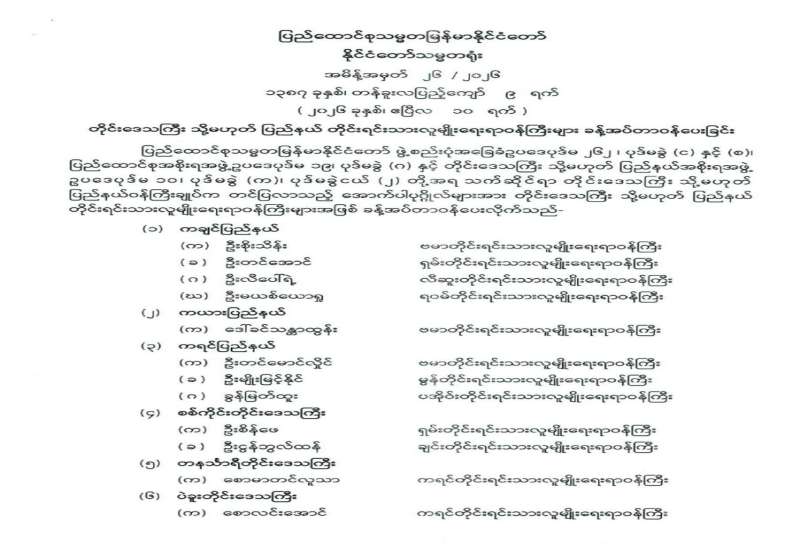 တိုင်းဒေသကြီး သို့မဟုတ် ပြည်နယ်တိုင်းရင်းသားလူမျိုးရေးရာဝန်ကြီးများ ခန့်အပ်တာဝန်ပေးခြင်း