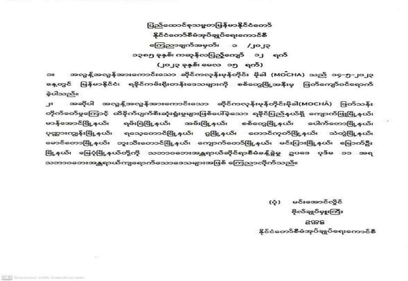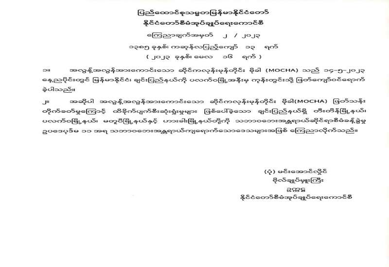 ဆိုင်ကလုန်းမုန်တိုင်း မိုခါကြောင့် ဘေးသင့်ပြည်သူများအတွက် ပြည်တွင်း/ပြည်ပ စေတနာရှင်ပြည်သူများက အလှူငွေများ လှူဒါန်းနိုင်ရေး အသိပေးကြေညာခြင်း