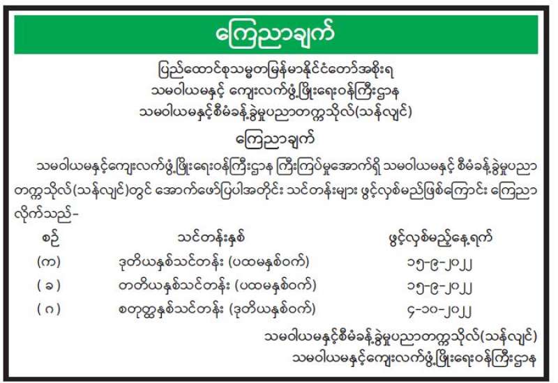 နိုင်ငံတော်စီမံအုပ်ချုပ်ရေးကောင်စီ၏ ၁၀.၁၂.၂၀၂၁ ရက်စွဲပါ အမိန့်ကြော်ငြာစာအမှတ်၊ ၃၆၆/၂၀၂၁ ဖြင့် တရားမဝင်ကုန်သွယ်မှုတိုက်ဖျက်ရေး ဦးဆောင်ကော်မတီကို ပြင်ဆင်ဖွဲ့စည်းခဲ့ပြီး တရားမဝင်ကုန်သွယ်မှုများကို ဥပဒေနှင့်အညီ ထိရောက်စွာအရေးယူ နိုင်ရေး ဆောင်ရွက်လျက်ရှိရာ “တရားမဝင်ကုန်သွယ်မှုသတင်းများ” နှင့်ပတ်သက်၍ အောက်ဖော်ပြပါ တယ်လီဖုန်း၊ ဖက်စ်ဖုန်းနှင့် အီးမေးလ်လိပ်စာတို့ကို လုံခြုံစိတ်ချစွာ တိုင်ကြားနိုင်ပါကြောင်း အသိပေးကြေညာအပ်ပါသည်-