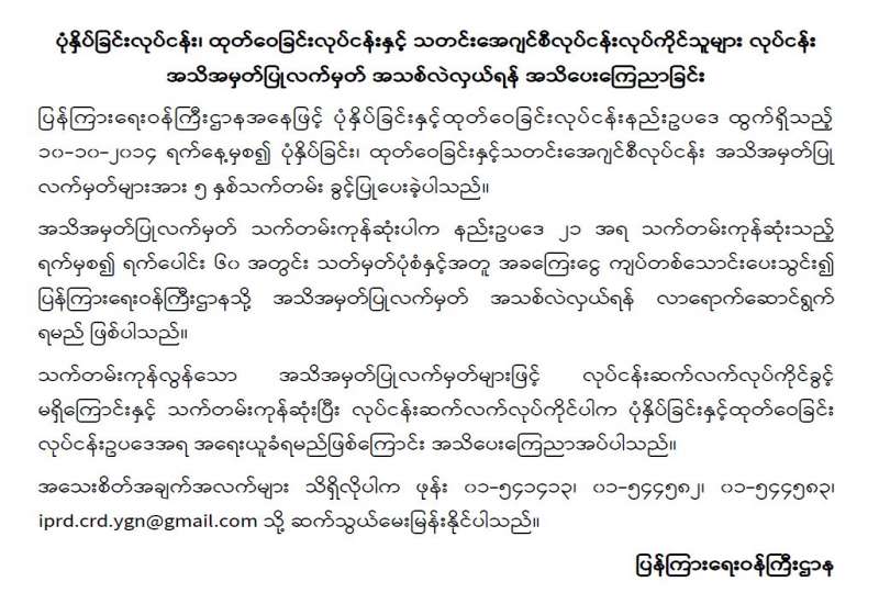 တေးသံသွင်းလုပ်ငန်းလုပ်ကိုင်သူများအား တေးသံသွင်းလုပ်ငန်းလုပ်ကိုင်ခွင့် မှတ်ပုံတင်လက်မှတ်အသစ်ပြုလုပ်ရန်နှင့် သက်တမ်းတိုးလဲလှယ်ရန် အသိပေးကြေညာခြင်း