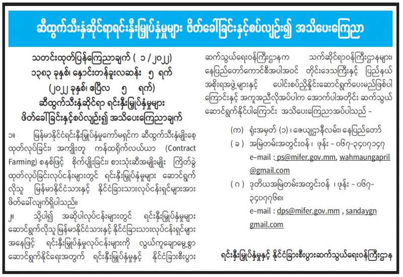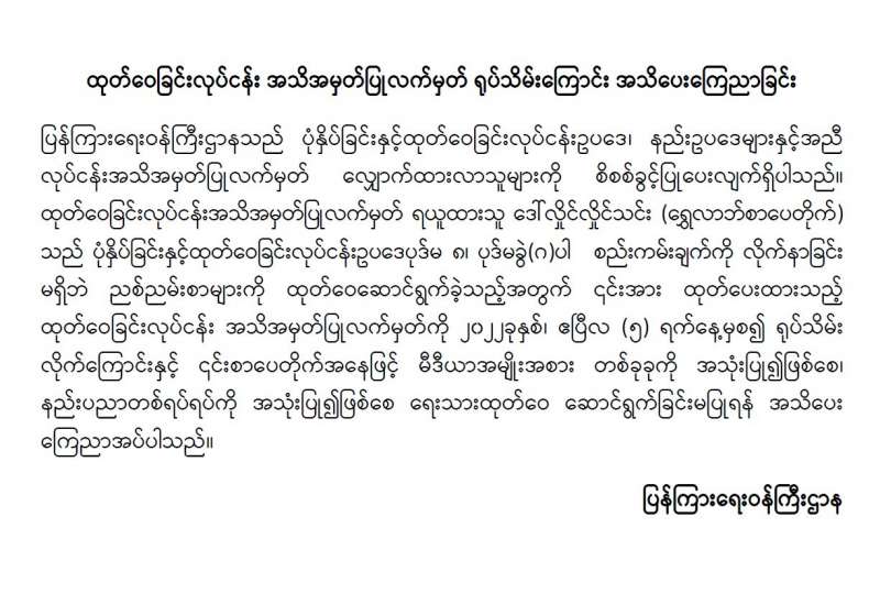 ၁။ ပြန်ကြားရေးဝန်ကြီးဌာနသည် ဒီမိုကရေစီစနစ်နှင့် လိုက်လျောညီထွေဖြစ်စေမည့် ဥပဒေ၊ နည်းဥပဒေများကိုရေးဆွဲပြဋ္ဌာန်းကာ ပုံနှိပ်ခြင်း၊ ထုတ်ဝေခြင်းလုပ်ငန်းများကို ကြီးကြပ်ဆောင်ရွက်ပေးလျက်ရှိပါသည်။