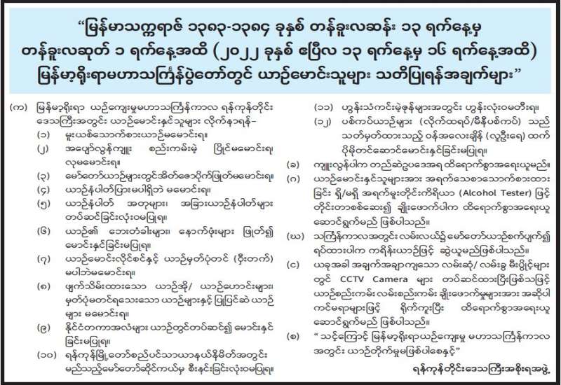 “ မြန်မာ့သက္ကရာဇ် ၁၃၈၃-၁၃၈၄ ခုနှစ် တန်ခူးလဆန်း ၁၃ ရက်နေ့မှ တန်ခူးလဆုတ် ၁ရက်နေ့အထိ (၂၀၂၂ ခုနှစ် ဧပြီလ ၁၃ ရက်နေ့မှ ၁၆ရက်နေ့အထိ) မြန်မာ့ရိုးရာမဟာသင်္ကြန်ပွဲတော်တွင် ယာဉ်မောင်းသူများ သတိပြုရန်အချက်များ