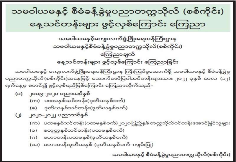 သမဝါယမနှင့် စီမံခန့်ခွဲမှုပညာတက္ကသိုလ် (စစ်ကိုင်း) နေ့သင်တန်းများ ဖွင့်လှစ်ကြောင်း ကြေညာ