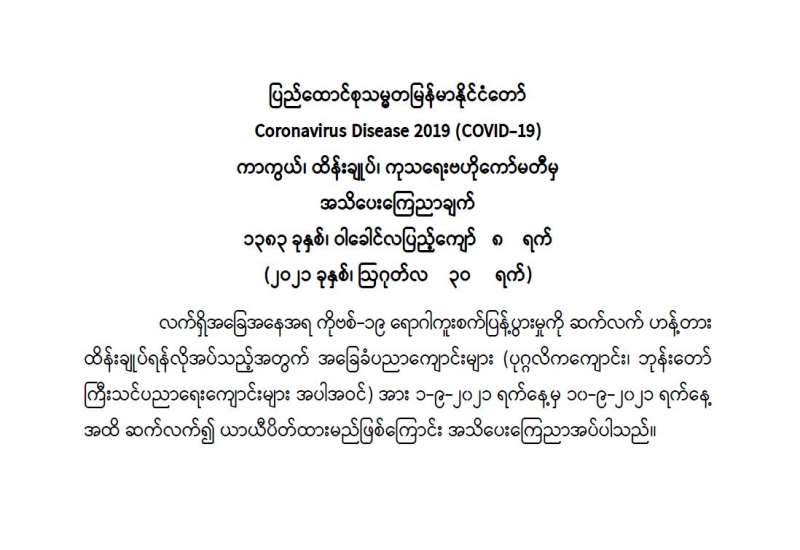 ပြည်ထောင်စုသမ္မတမြန်မာနိုင်ငံတော် Coronavirus Disease 2019 (COVID-19) ကာကွယ်၊ ထိန်းချုပ်၊ ကုသရေးဗဟိုကော်မတီမှ အသိပေးကြေညာချက်