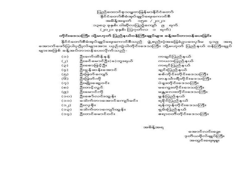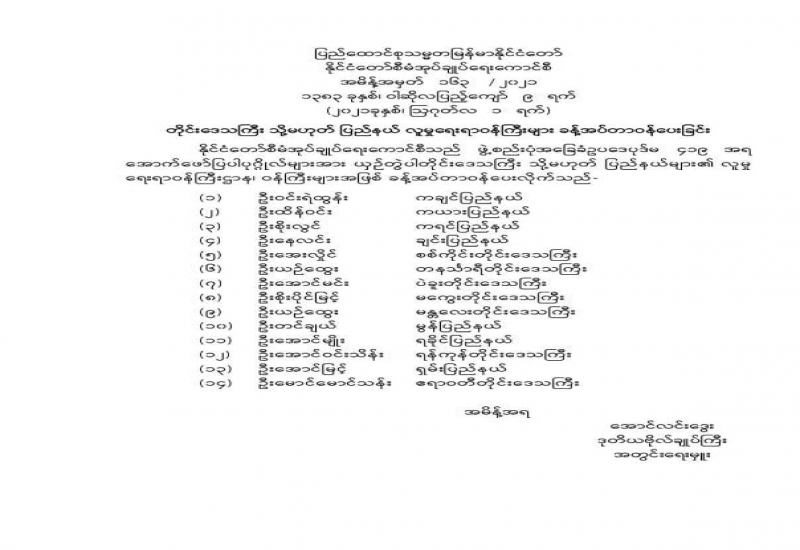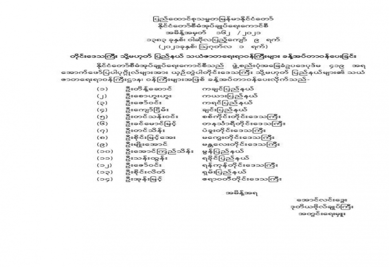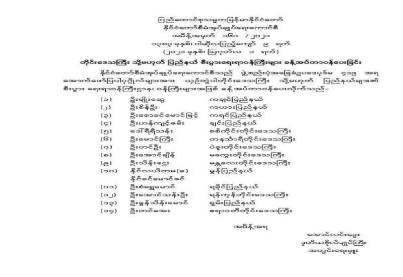 တိုင်းဒေသကြီး သို့မဟုတ် ပြည်နယ် တိုင်းရင်းသားရေးရာဝန်ကြီးများ ခန့်အပ်တာဝန်ပေးခြင်း