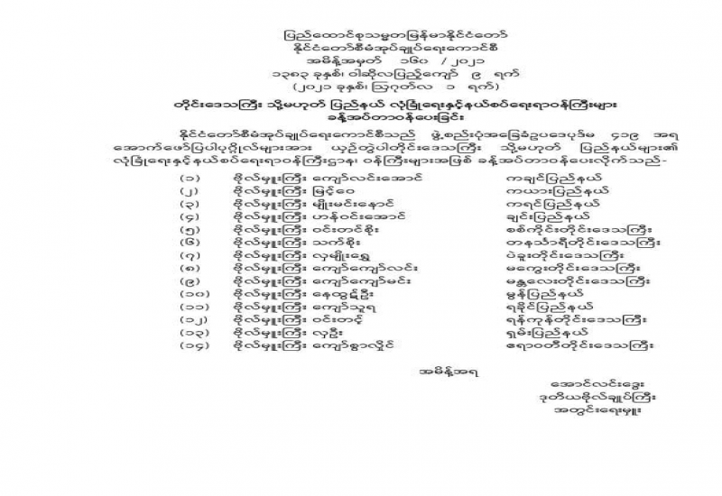 တိုင်းဒေသကြီး သို့မဟုတ် ပြည်နယ် သယံဇာတရေးရာဝန်ကြီးများ ခန့်အပ်တာဝန်ပေးခြင်း
