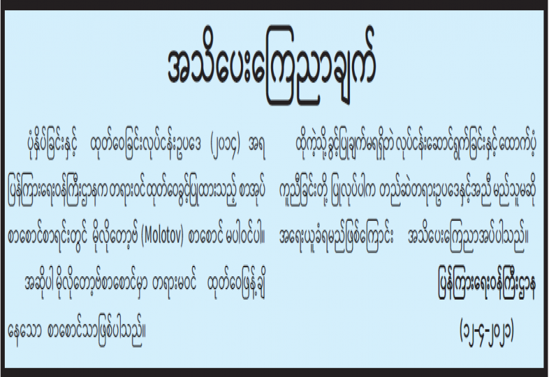 တရားမဝင်အဖွဲ့အစည်းနှင့် သတင်းဌာနအချို့သည် တရားမဝင်သော ဂြိုဟ်တုစလောင်း များမှတစ်ဆင့် ရုပ်သံလိုင်းများတွင် နိုင်ငံတော်စီမံအုပ်ချုပ်ရေးကောင်စီက အရေးပေါ်ကာလဆိုင်ရာ ပြဋ္ဌာန်းချက်များနှင့်အညီ ဆောင်ရွက် နေစဉ်ကာလအတွင်း နိုင်ငံတော်လုံခြုံရေး ၊ တရားဥပဒေ စိုးမိုးရေး၊ အများပြည်သူ အေးချမ်း သာယာရေး တို့ကို ထိခိုက်စေသော အကြောင်းအရာများနှင့် နိုင်ငံတော်အား သစ္စာဖောက်ဖျက်ပုန်ကန်မှု ကျူးလွန် နေသူများကို အားပေးကူညီရာ ရောက်သည့် အကြောင်းအရာများကို ထုတ်လွှင့်လျက်ရှိကြောင်း တွေ့ရှိရပါသည်။