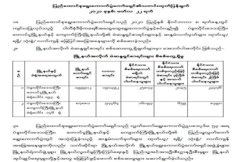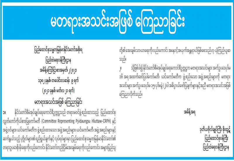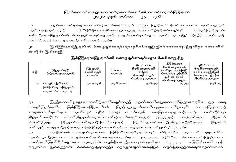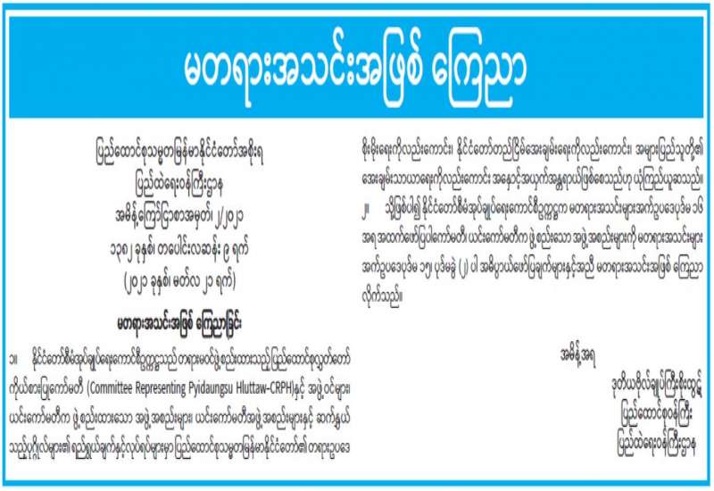 ၁။ နိုင်ငံတော်စီမံအုပ်ချုပ်ရေးကောင်စီ၏ ၁၃၈၂ ခုနှစ်၊ တပေါင်းလဆန်း ၂ ရက်၊ ၂၀၂၁ ခုနှစ်၊ မတ်လ ၁၄ ရက်စွဲပါ စစ်အုပ်ချုပ်ရေး(Martial Law)အမိန့်အမှတ် ၁/ ၂၀၂၁၊ ၁၃၈၂ ခုနှစ်၊ တပေါင်း လဆန်း ၃ ရက်၊ ၂၀၂၁ ခုနှစ်၊ မတ်လ ၁၅ ရက်စွဲပါ စစ်အုပ်ချုပ်ရေး(Martial Law)အမိန့်အမှတ် ၂/ ၂၀၂၁ တို့ ဖြင့် ရန်ကုန်တိုင်းစစ်ဌာနချုပ်၊ တိုင်းမှူးအား စစ်အုပ်ချုပ်ရေးဒေသအဖြစ် ကြေညာထားသော ရန်ကုန်တိုင်းစစ်ဌာနချုပ်နယ်မြေ ဖြစ်သည့် ရန်ကုန်တိုင်းဒေသကြီး၊ လှိုင်သာယာမြို့နယ်၊ ရွှေပြည်သာ မြို့နယ်၊ ဒဂုံမြို့သစ်(မြောက်ပိုင်း)မြို့နယ်၊ ဒဂုံမြို့သစ်(တောင်ပိုင်း)မြို့နယ်၊ ဒဂုံမြို့သစ်(ဆိပ်ကမ်း) မြို့နယ် နှင့် မြောက်ဥက္ကလာပမြို့နယ်များအတွင်း လုံခြုံရေး၊ တရားဥပဒေစိုးမိုးရေးနှင့် နယ်မြေအေးချမ်းသာယာ ရေးကို ပိုမိုထိရောက်စွာဆောင်ရွက်နိုင်ရန်အလို့ငှာ အုပ်ချုပ်ရေးနှင့် တရားစီရင်ရေးဆိုင်ရာ စစ်အုပ်ချုပ်ရေး (Martial Law) အာဏာကိုကျင့်သုံးရန် ဖွဲ့စည်းပုံအခြေခံဥပဒေ ပုဒ်မ ၄၁၉ အရ အပ်နှင်းခဲ့ပါသည်။